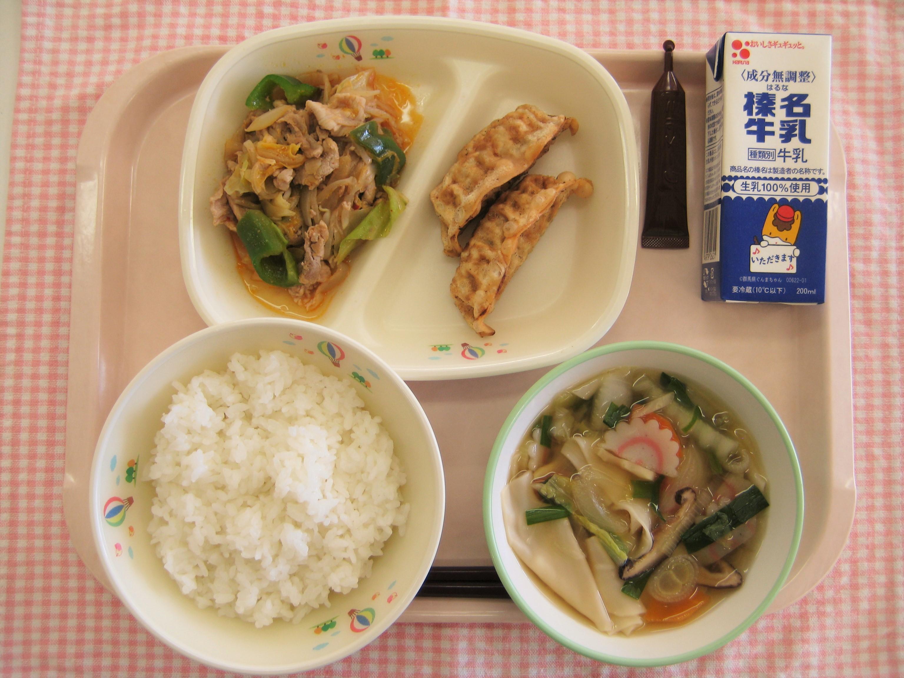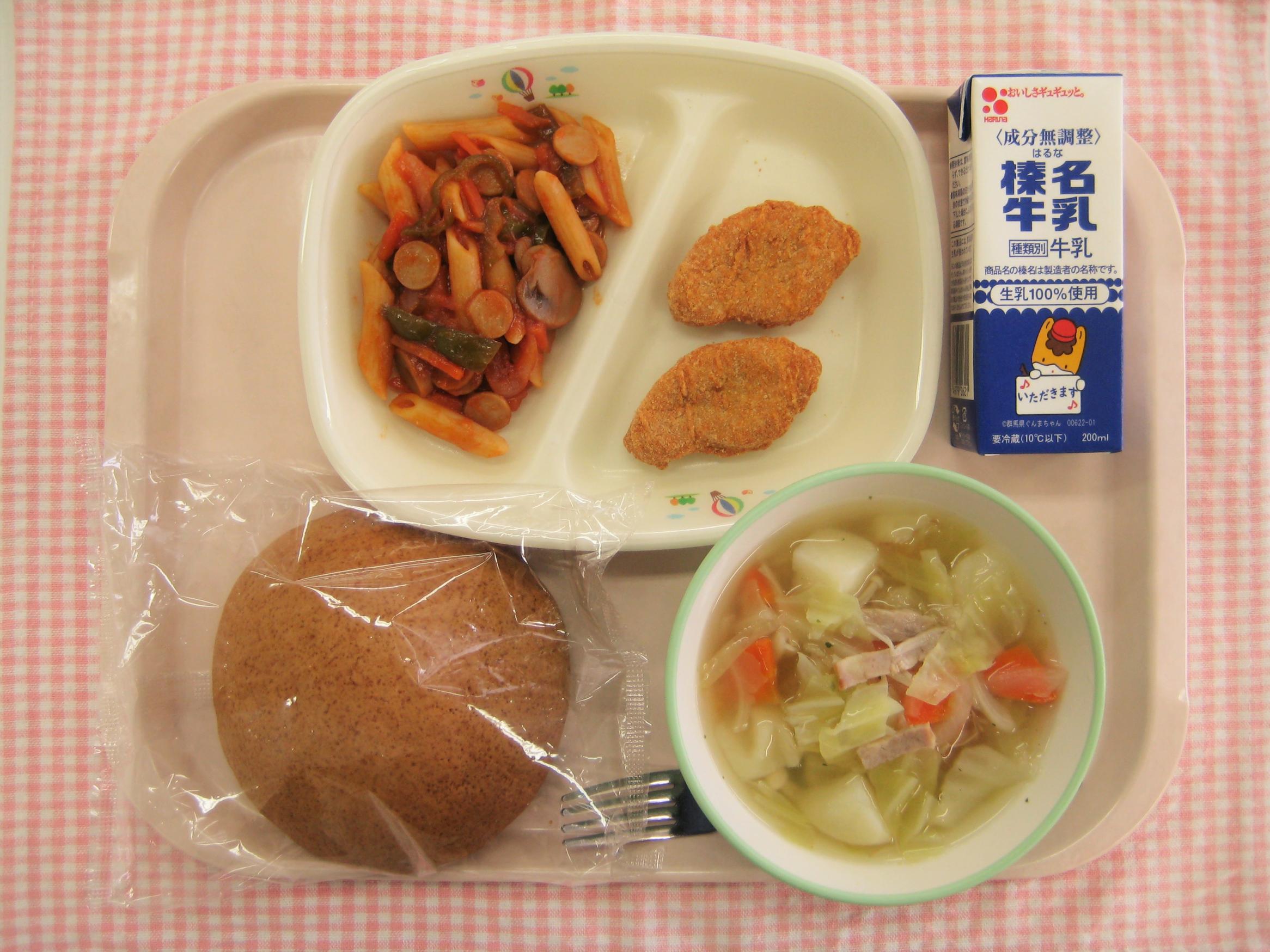 【子持中学校3年生リクエスト献立】 ~給食でソフト麺が登場した頃にちなんだ献立~ パックラーメン 牛乳 ショーロンポー ピリ辛こんにゃく 豚骨ラーメンスープ | 27 全国学校給食週間