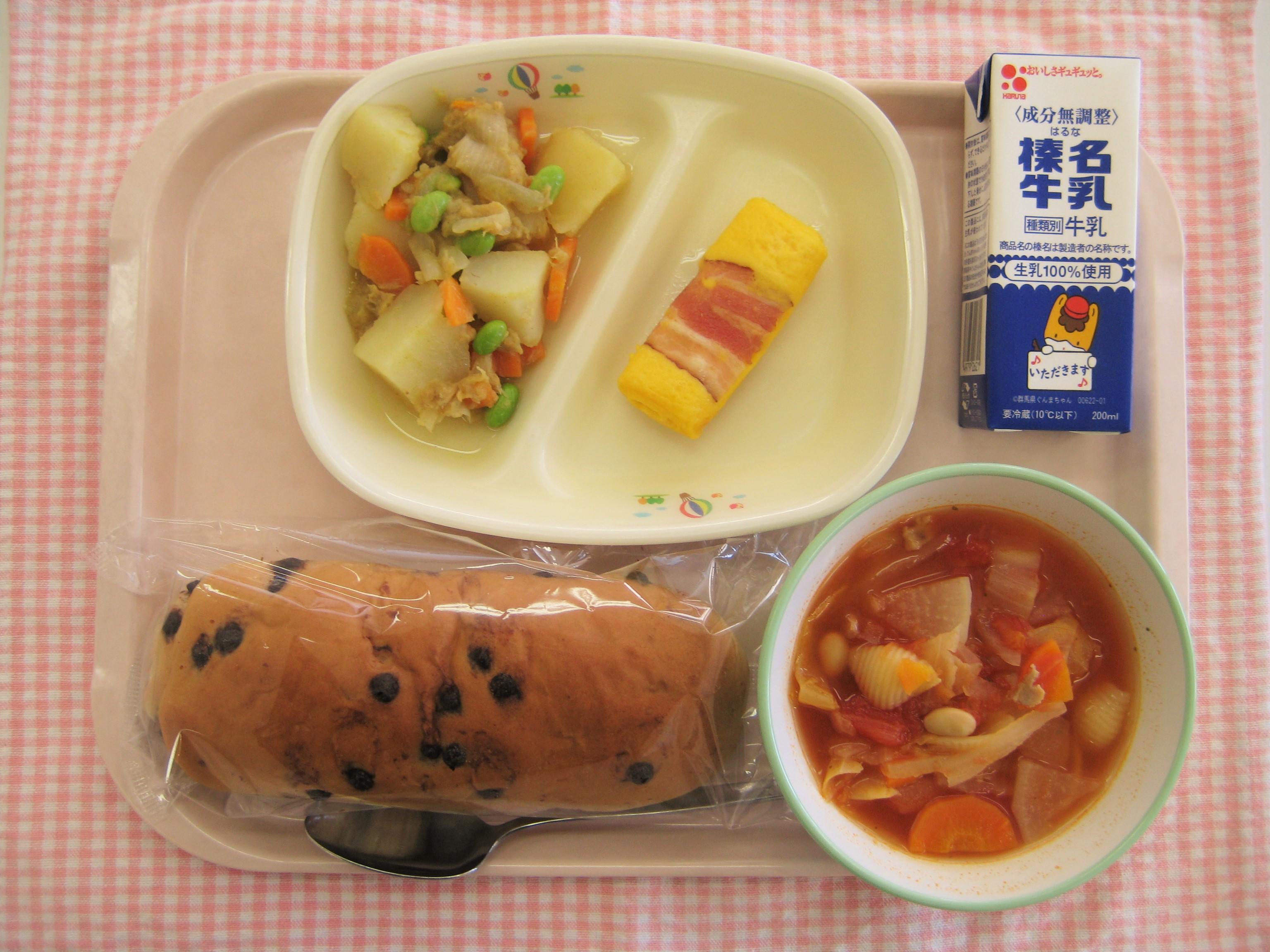 | 9 チョコチップパン 牛乳 ベーコンエッグ ツナじゃが ミネストローネ