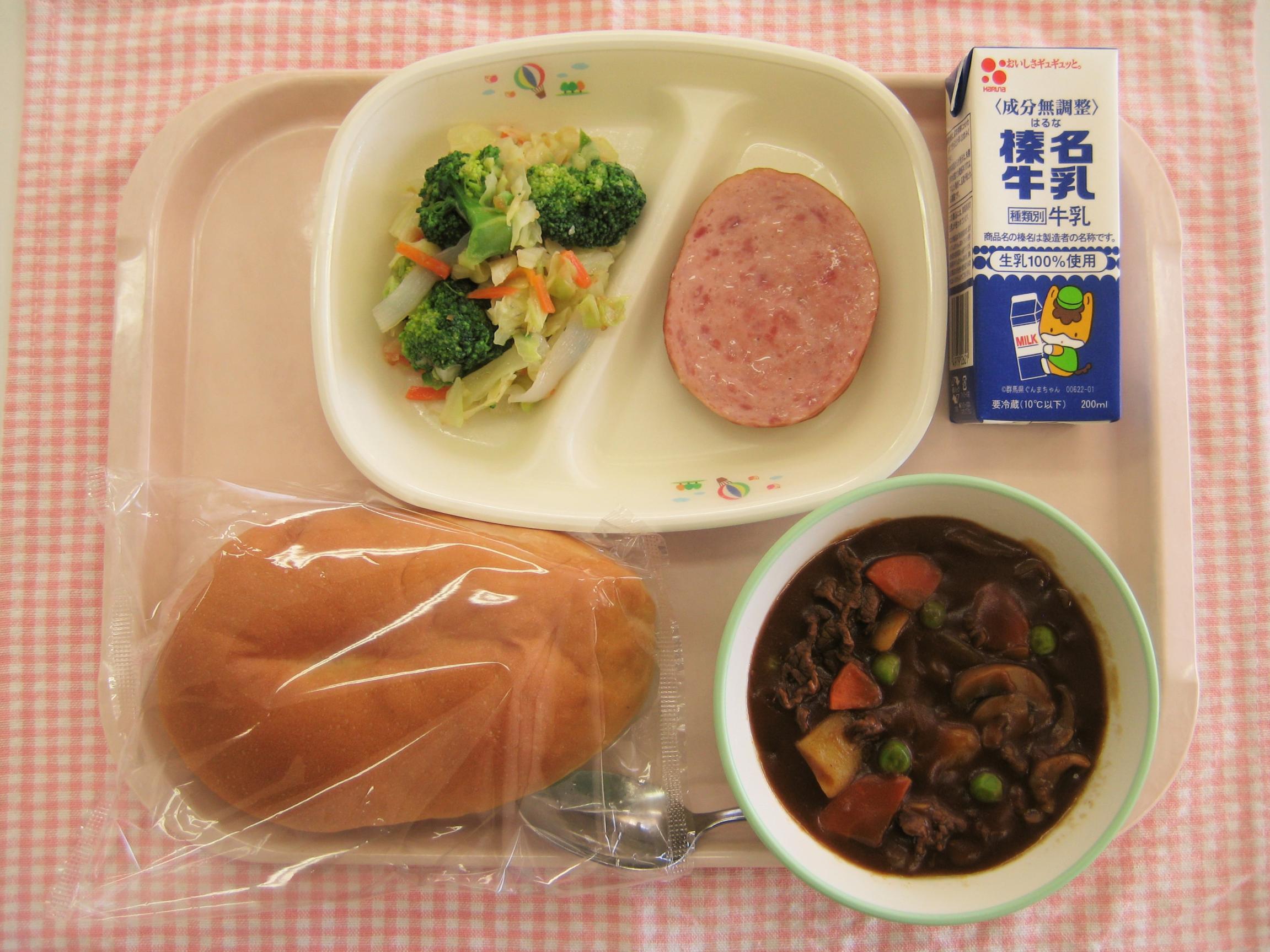 ~戦後、パン、ミルク、おかずの完全給食になった頃の給食にちなんだ献立~ コッペパン 牛乳 ミートオムレツ フレンチサラダ トマトクリームシチュー | 29 全国学校給食週間