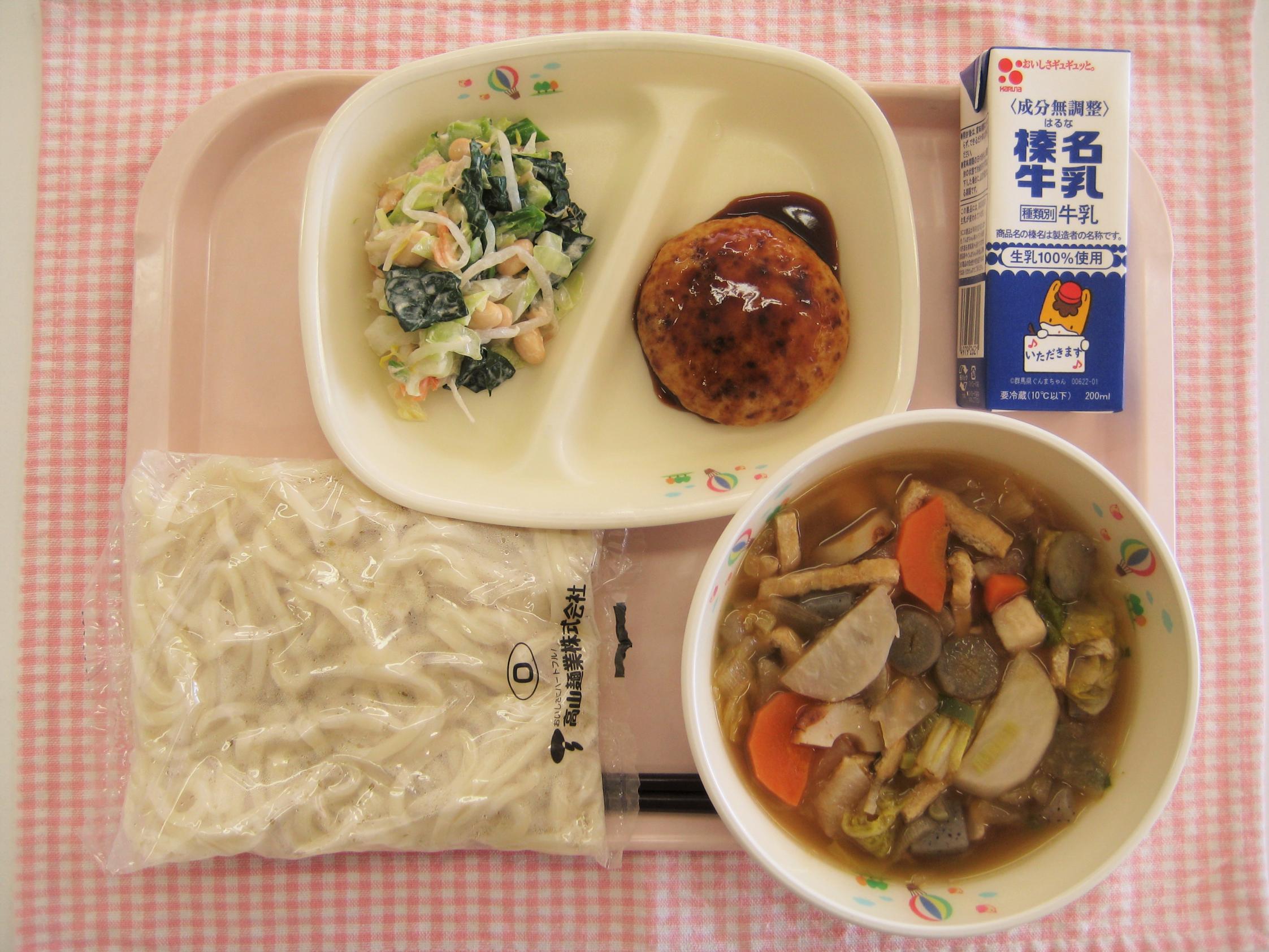 | 15 【郷土料理:青森県】 わかめごはん 牛乳 いかピリ辛焼き ねりこみ せんべい汁 | 16 【郷土料理:群馬県】 パックうどん 牛乳 焼きまんじゅう アレッタと大豆のサラダ けんちんうどん汁 |