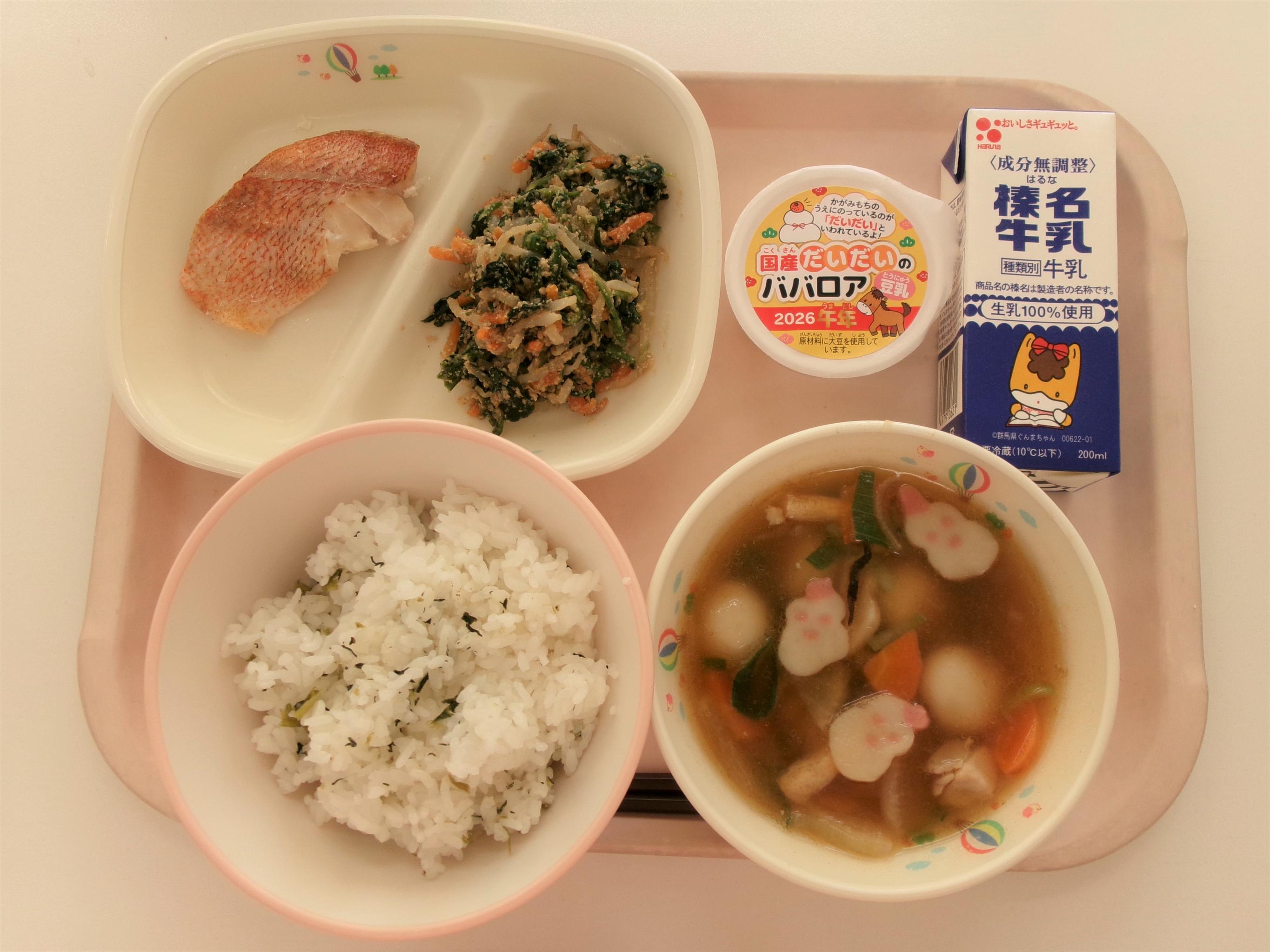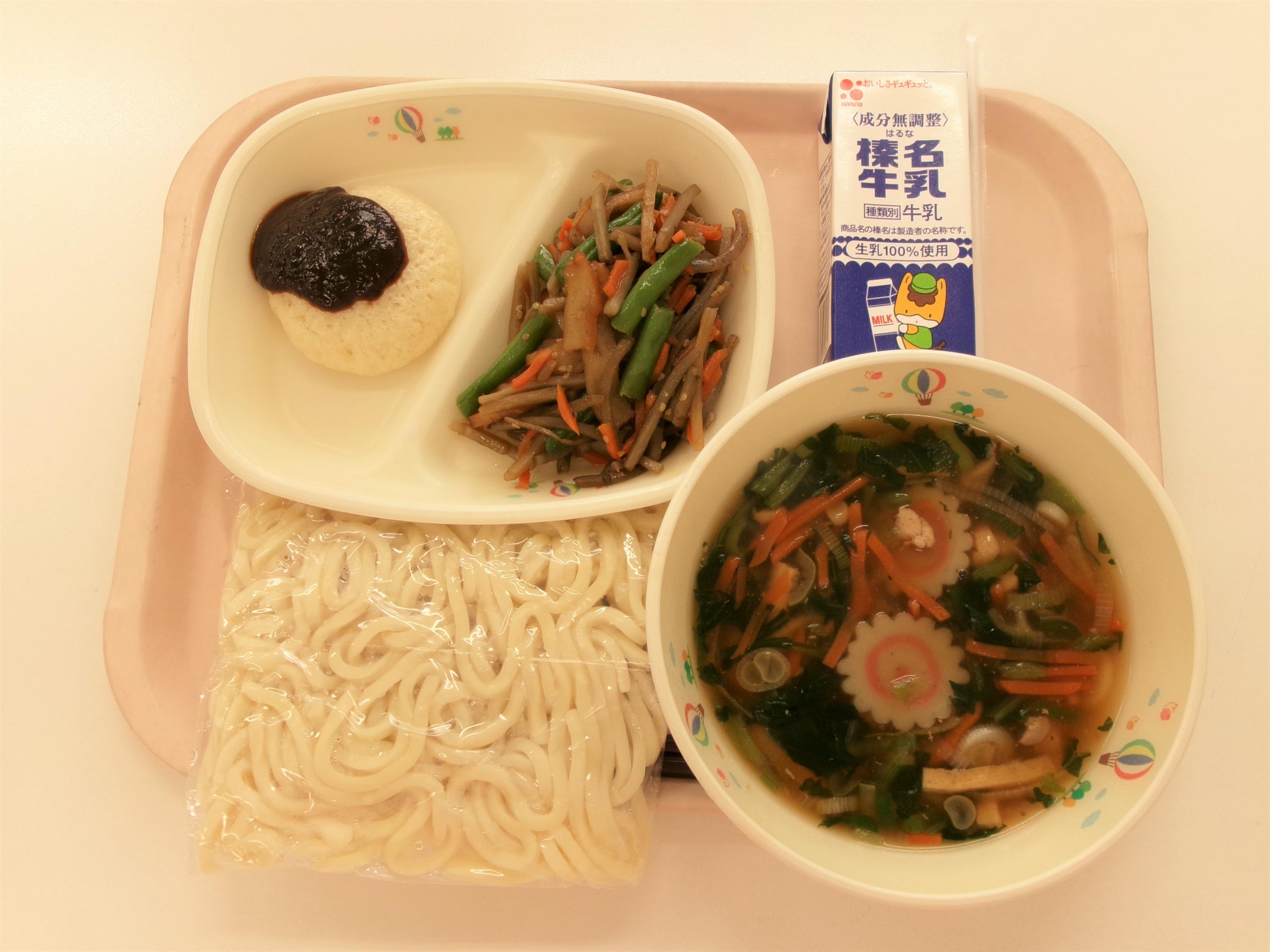 | 8 ~かみかみ献立~ うどん☆パックめん 牛乳 あんかけうどん汁 五目きんぴら 蒸しまんじゅうみそだれがけ | 9 ~小正月の行事食~ 菜飯 牛乳 赤魚の白醤油焼き お雑煮 ほうれん草のごまあえ だいだいのババロア |
