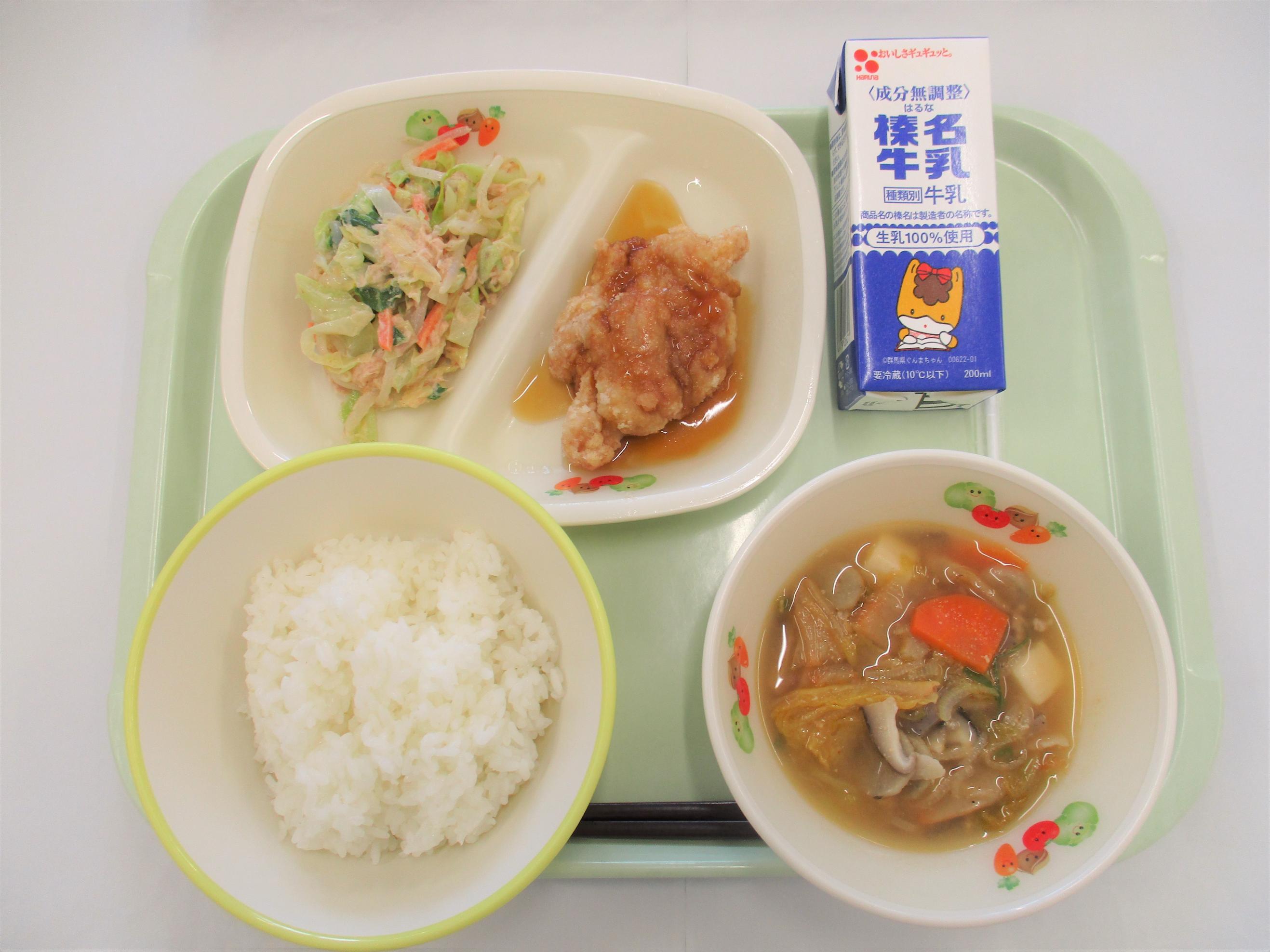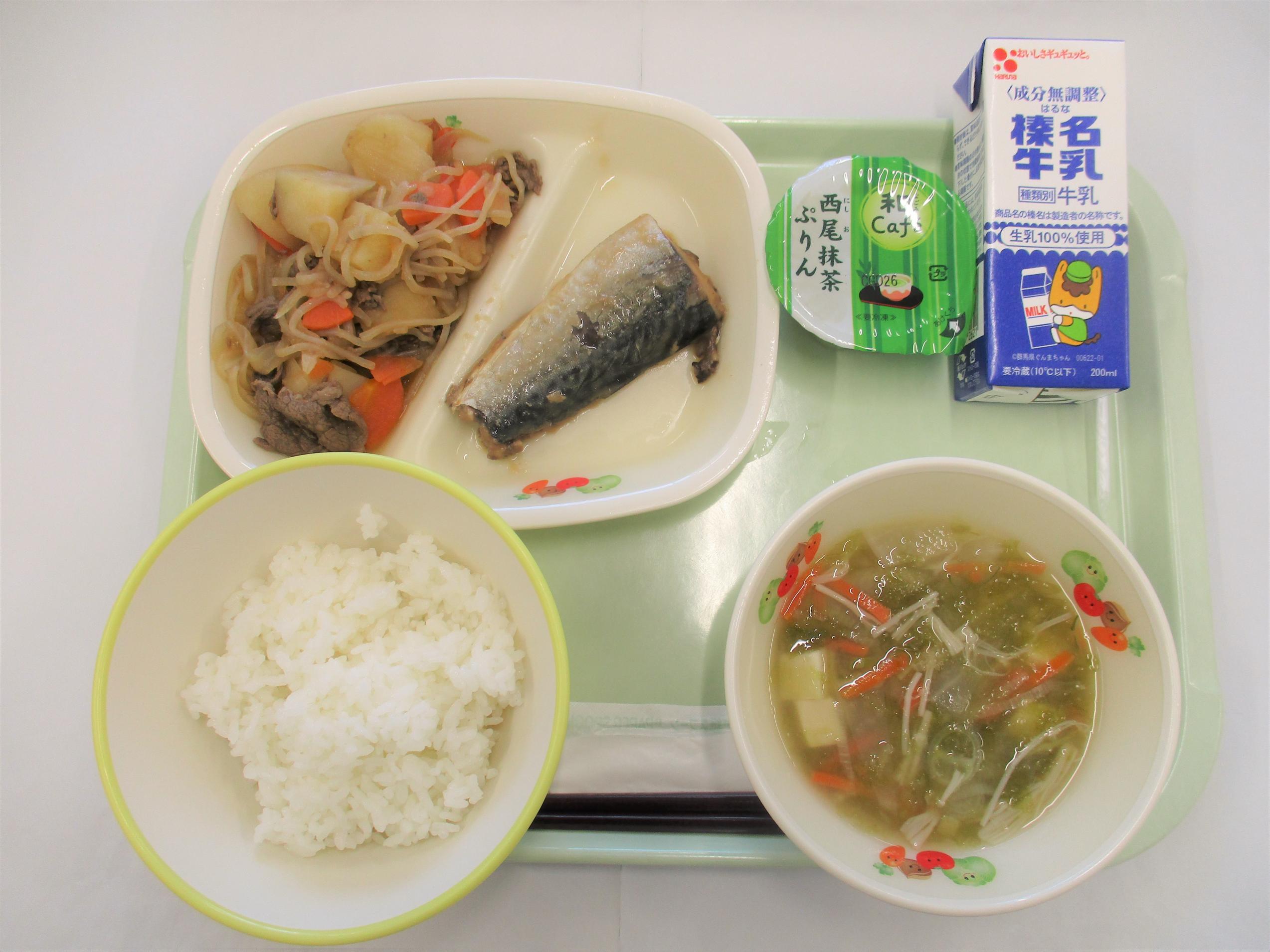 | 7 丸パン横切り 牛乳 ハンバーグトマトソース 津久田っ子サラダ 豆乳コーンスープ | 8 ごはん 牛乳 揚げ鶏の甘酢だれ チンゲン菜のおかかマヨ和え ごまキムチ汁 | 9 [三重県の特産品を使った献立] ごはん 牛乳 さばのみそ煮 肉じゃが あおさのみそ汁 ミルク入り抹茶プリン |