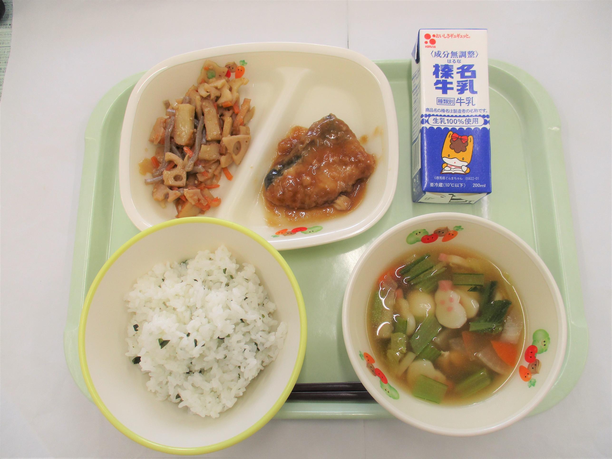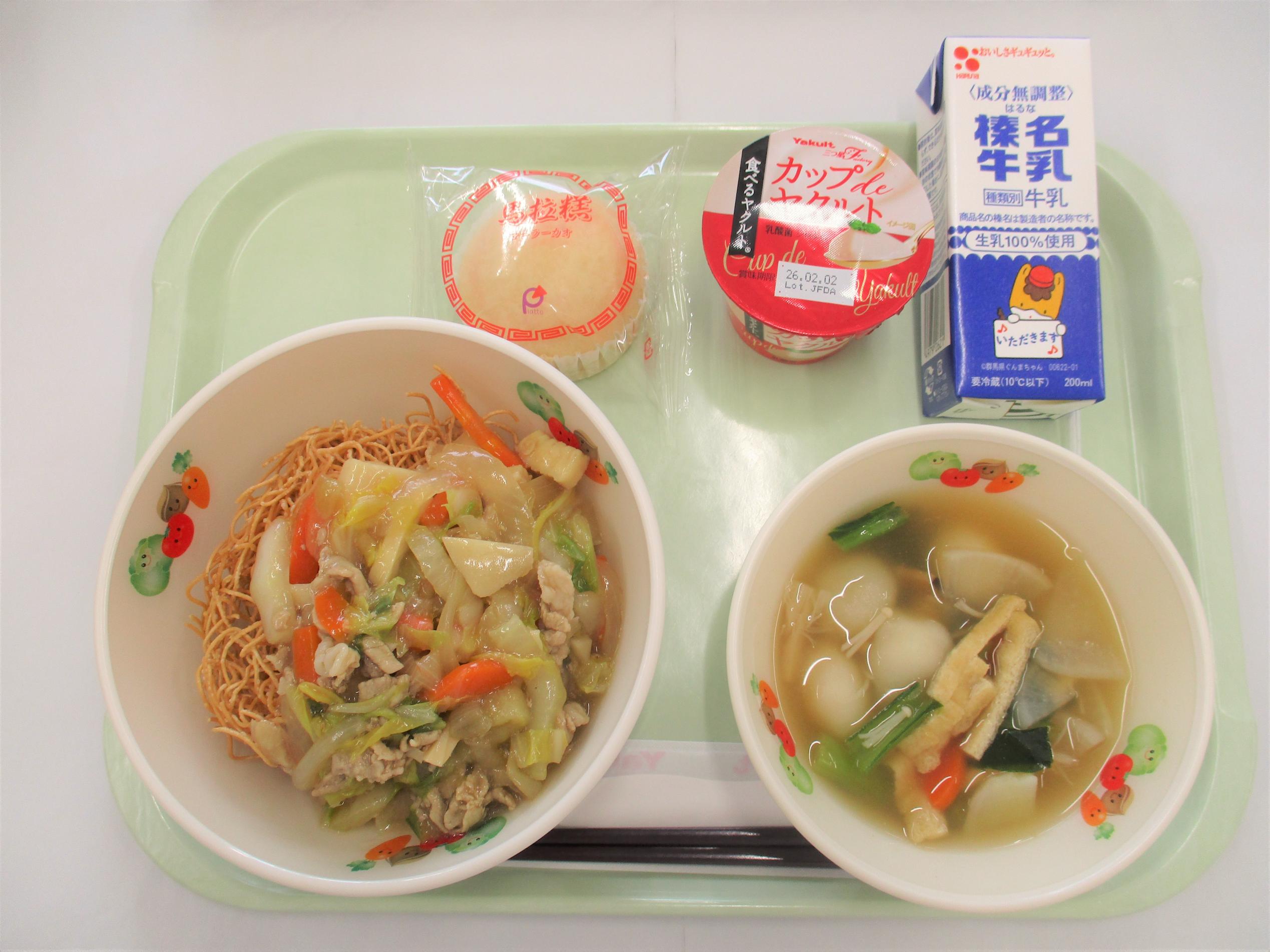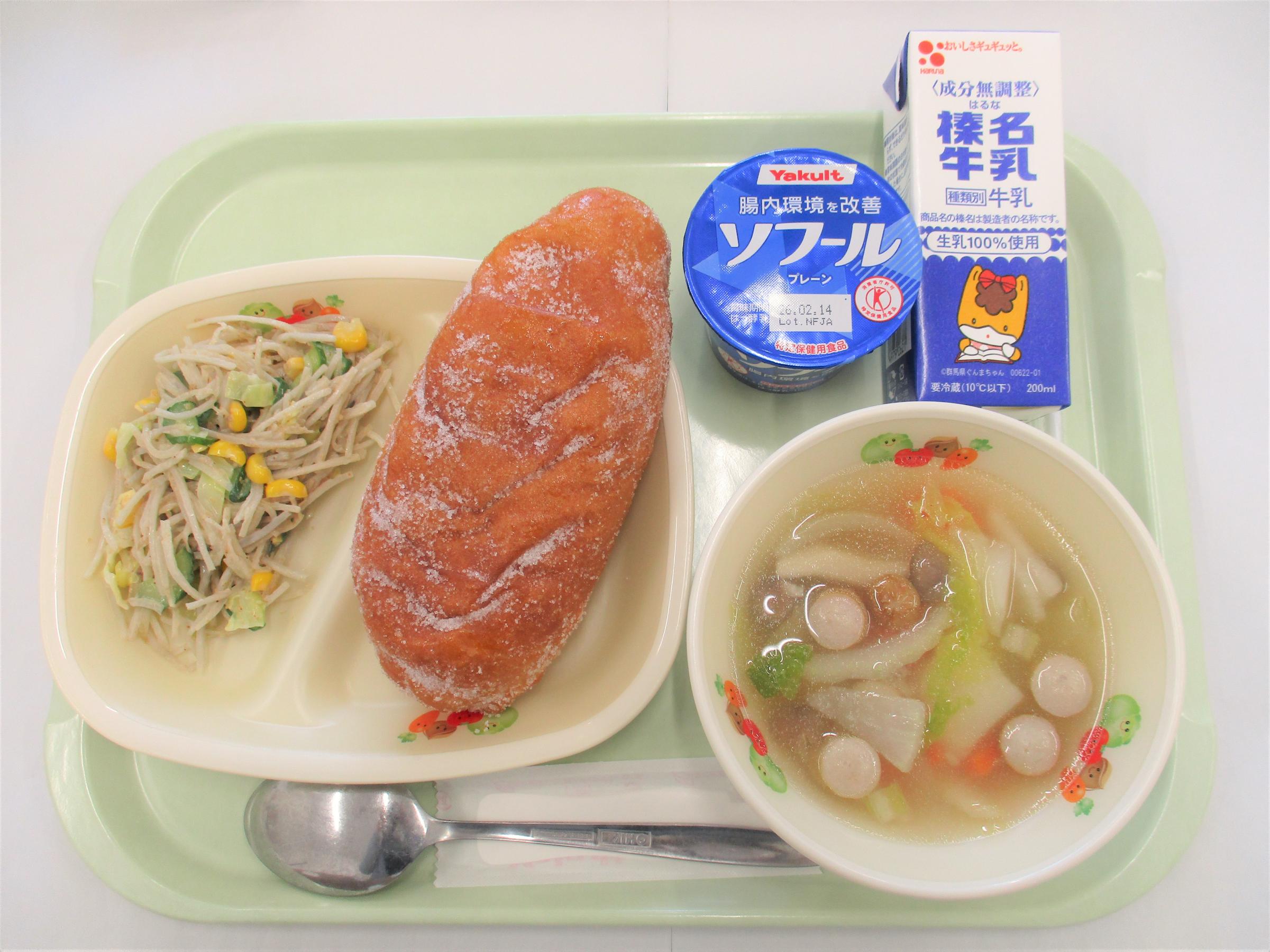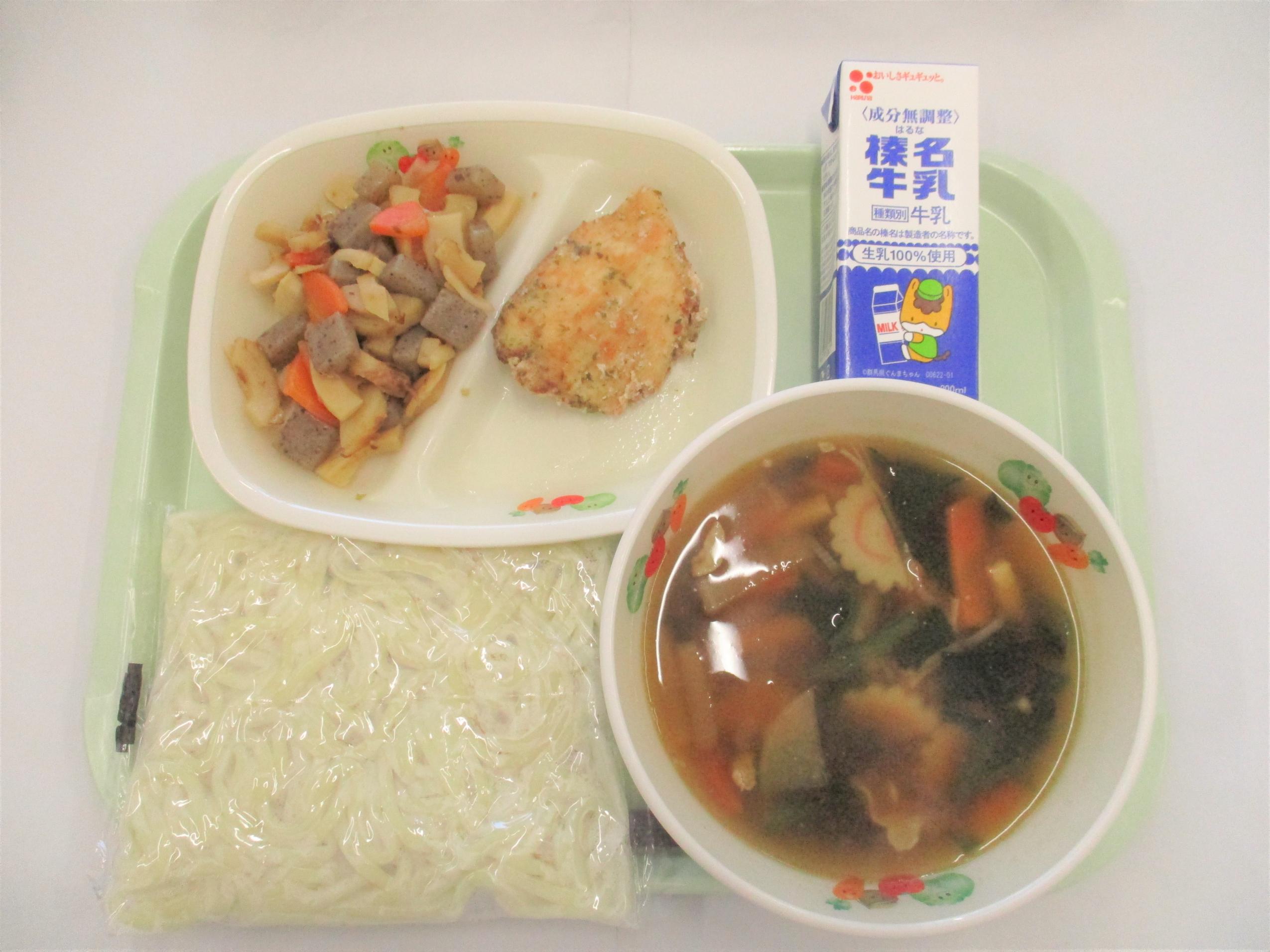 26 [全国学校給食週間] (昭和27年頃の給食) コッペパン 牛乳 キャベツと大豆のソースメンチ 野菜サラダ カレーシチュー | 27 [全国学校給食週間] (明治22年初めての給食) ごはん 牛乳 サケの塩焼き たくあん和え すいとん 給食週間ゼリー(はちみつゆずゼリー) のりふりかけ | 28 [全国学校給食週間] (昭和29年頃の給食揚げパン) シュガー揚げパン 牛乳 ごぼうサラダ 冬野菜のポトフ ヨーグルト | 29 [全国学校給食週間] (昭和40年頃の給食ソフトめん) 辛みそラーメン 牛乳 ショーロンポー かむかむ海藻サラダ ミルメーク | 30 [全国学校給食週間] (渋川市と北群馬の特産物を使います) しぶきた丼 牛乳 ふるさと汁 りんご