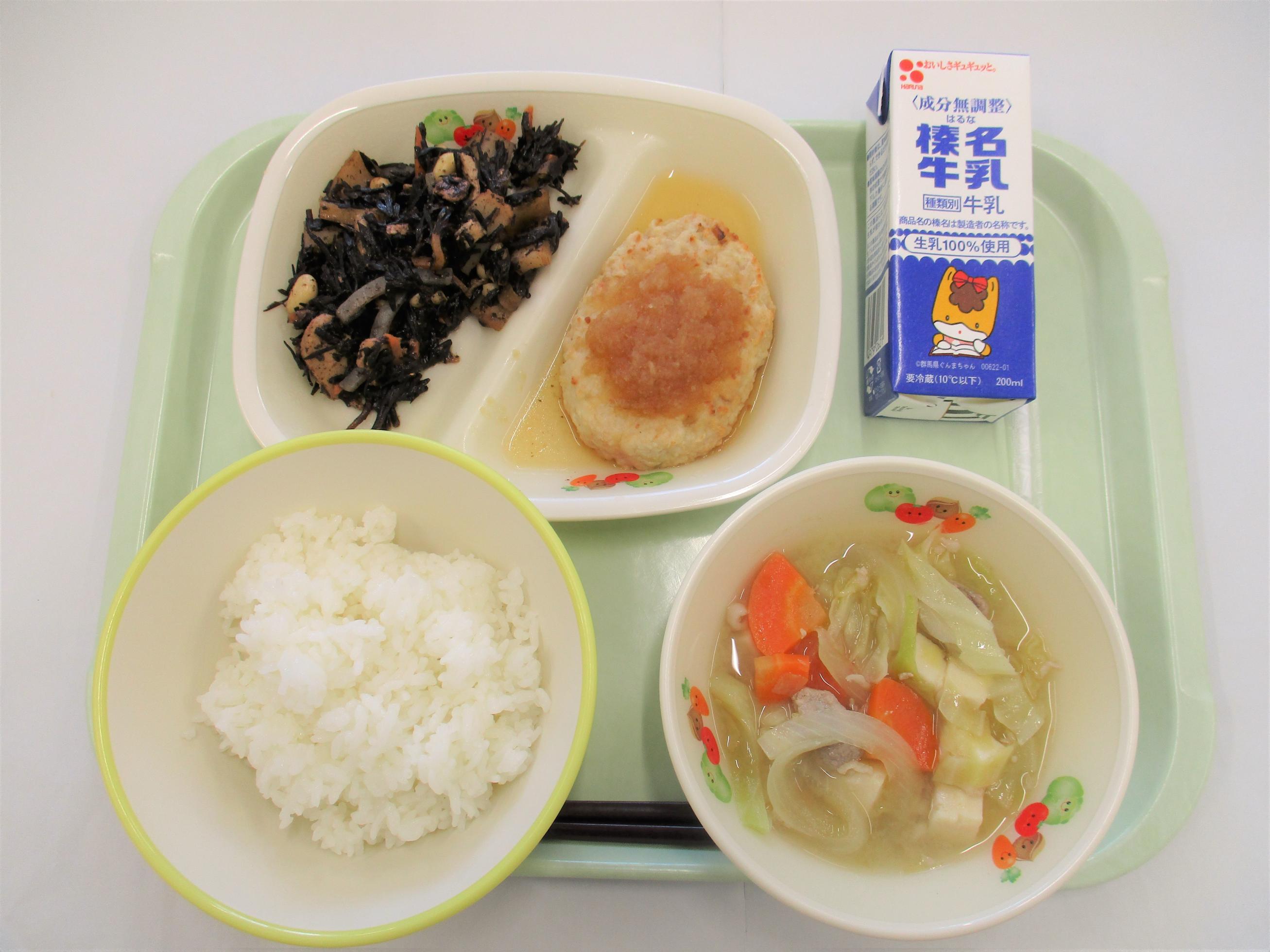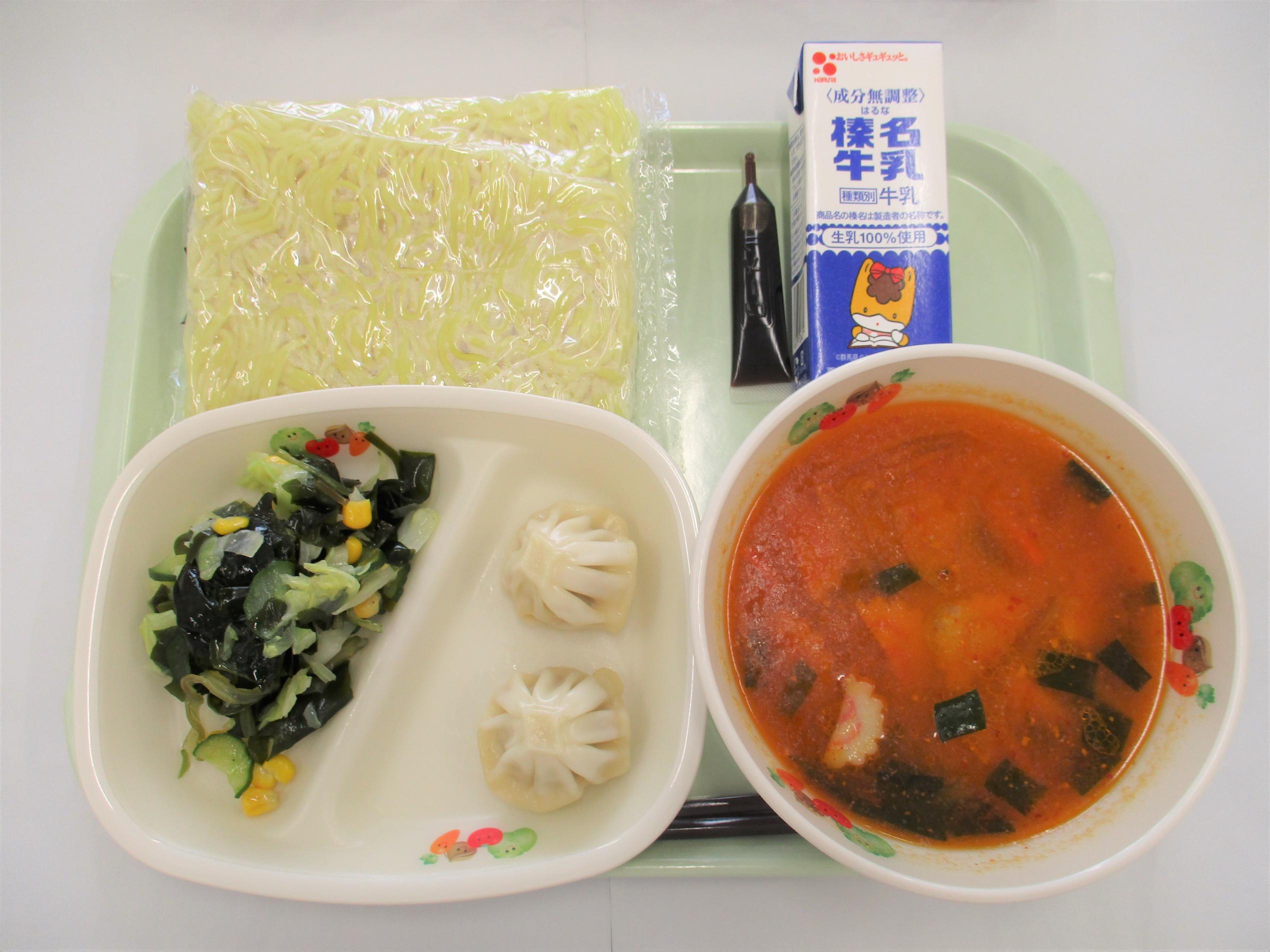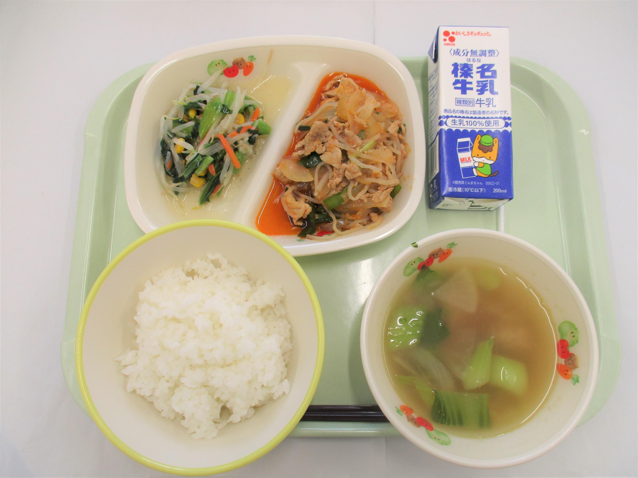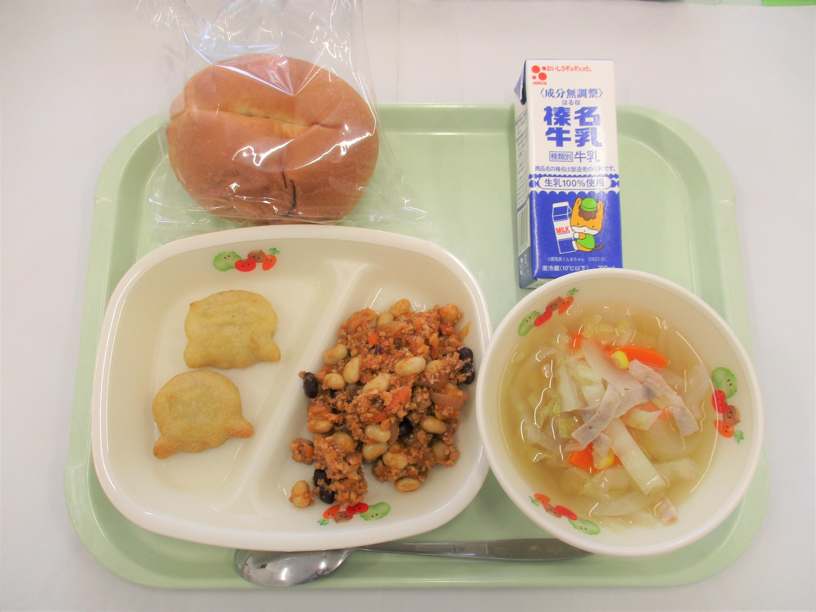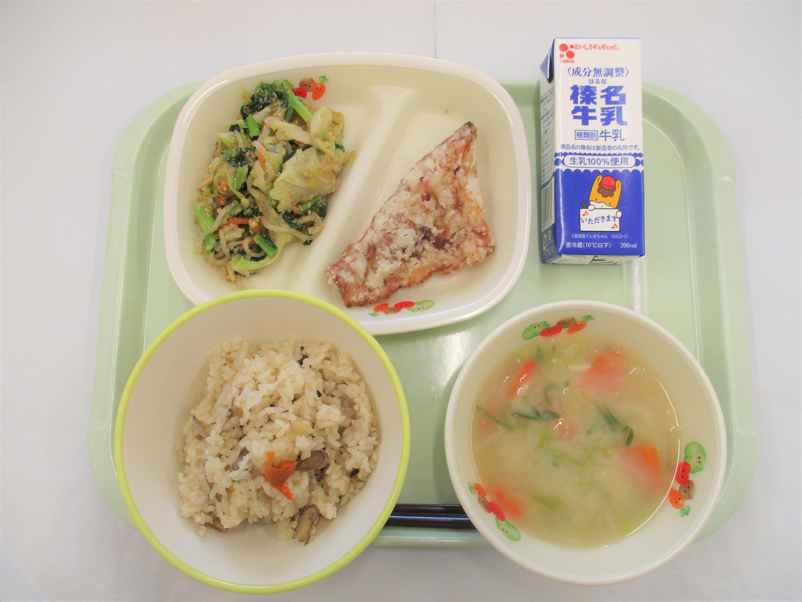 26 [全国学校給食週間] (昭和27年頃の給食) コッペパン 牛乳 キャベツと大豆のソースメンチ 野菜サラダ カレーシチュー | 27 [全国学校給食週間] (明治22年初めての給食) ごはん 牛乳 サケの塩焼き たくあん和え すいとん 給食週間ゼリー(はちみつゆずゼリー) のりふりかけ | 28 [全国学校給食週間] (昭和29年頃の給食揚げパン) シュガー揚げパン 牛乳 ごぼうサラダ 冬野菜のポトフ ヨーグルト | 29 [全国学校給食週間] (昭和40年頃の給食ソフトめん) 辛みそラーメン 牛乳 ショーロンポー かむかむ海藻サラダ ミルメーク | 30 [全国学校給食週間] (渋川市と北群馬の特産物を使います) しぶきた丼 牛乳 ふるさと汁 りんご