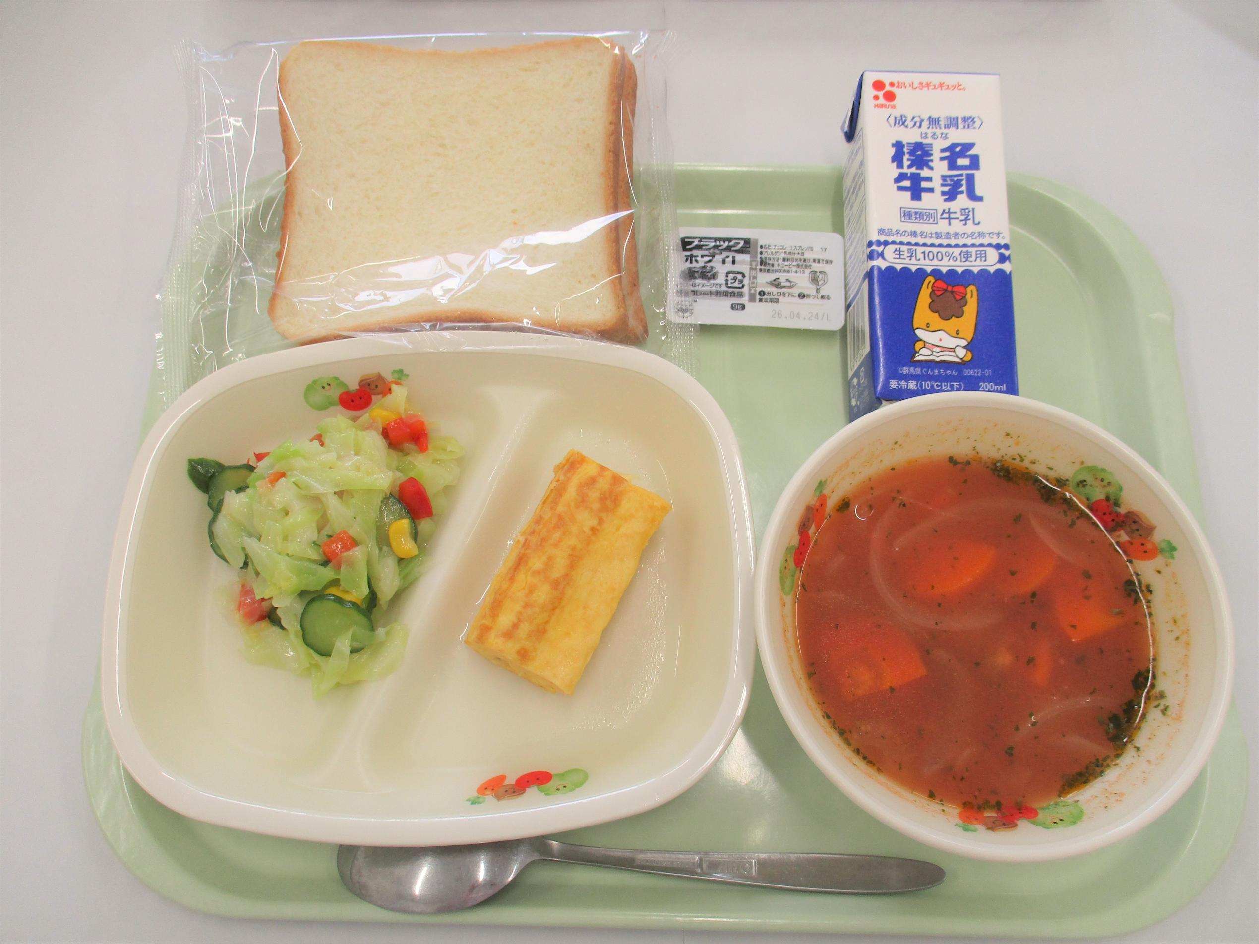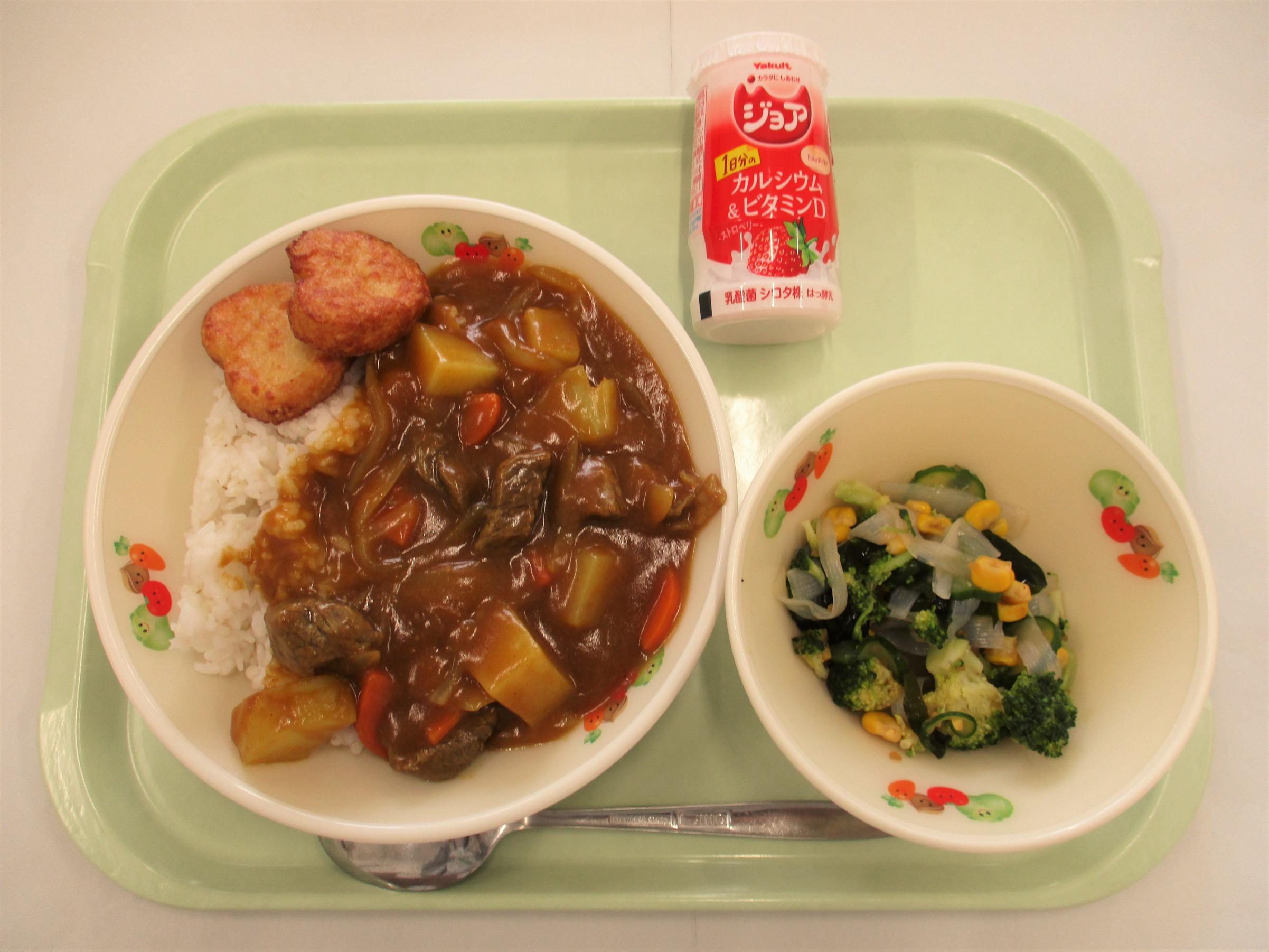 19 [郷土料理:長崎県] 皿うどん 牛乳 じゃがいもだんご汁 マーラーカオ 中のみ:クリーミーヨーグルト | 20 上州かみなりごはん 牛乳 赤魚塩麹揚げ | 21 [世界の料理:モンテネグロ] 食パン 牛乳 ウインナー卵ロール フレンチサラダ ブロデット ミルク入りチョコクリーム | 22 麦ごはん ジョア(ストロベリー) FMチキンナゲット ヘルシーサラダ ビーフカレー | 23 ごはん 牛乳 豆腐ハンバーグおろしソース ひじきの炒め煮 キャベ豚汁