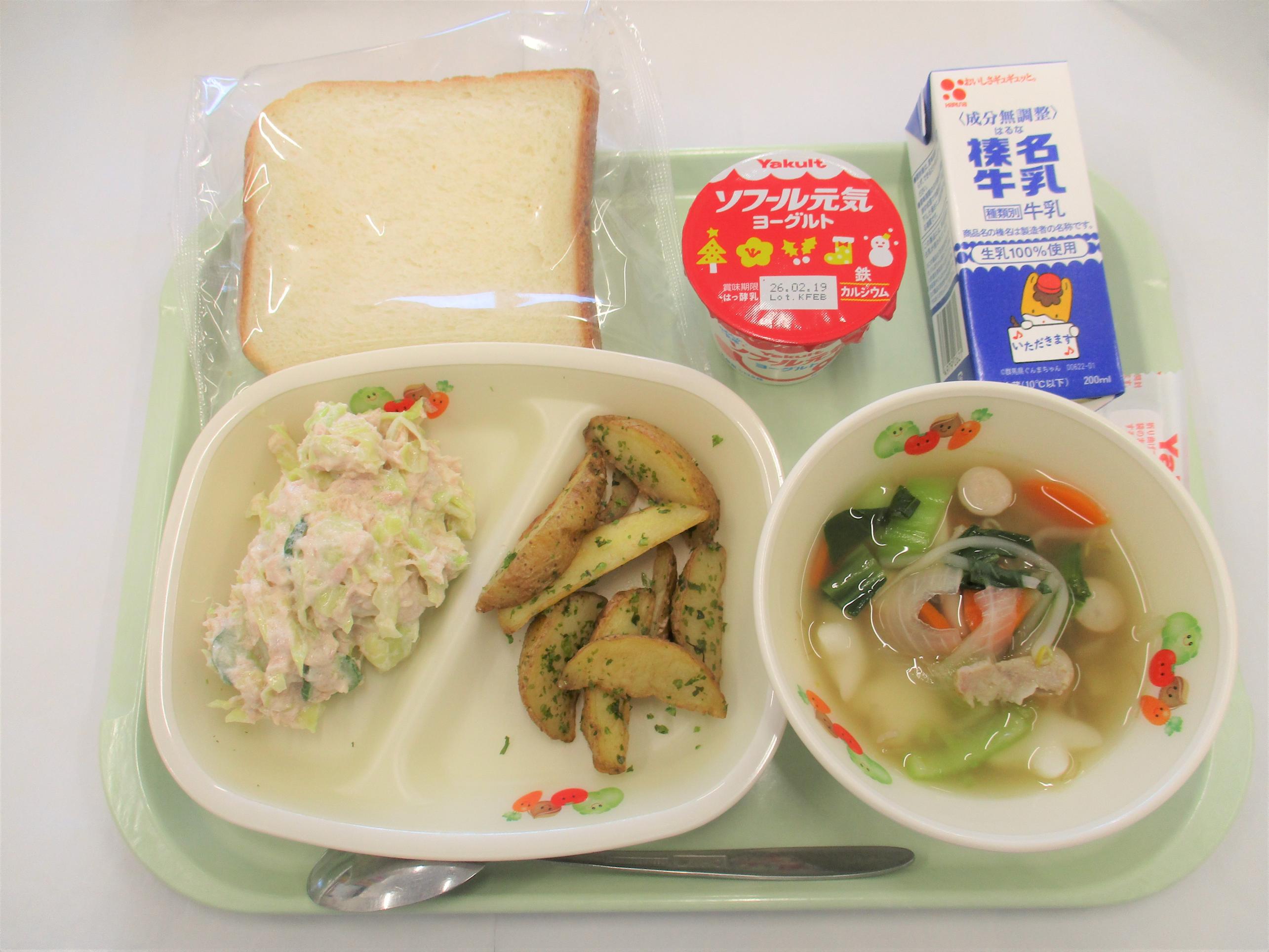 2 [ミラノ・コルティナオリンピック応援献立「イタリア共和国」] ツイストロールパン 牛乳 ハニーマスタードチキン イタリアンサラダ ラビオリのトマトスープ 豆乳パンナコッタ(いちごソース) | 3 [節分にちなんだ献立] ごはん 牛乳 イワシのかばやき れんこんとひじきの和え物 節分けんちん汁 | 4 食パン 牛乳 青のりポテト ツナサンドの具 米粉のマカロニスープ ヨーグルト | 5 麦ごはん ジョア(プレーン) まめまめサラダ ポークカレー 青のり小魚 | 6 ごはん 牛乳 厚焼き卵 キンパ風のり巻きの具 トッポギスープ 手巻きのり
