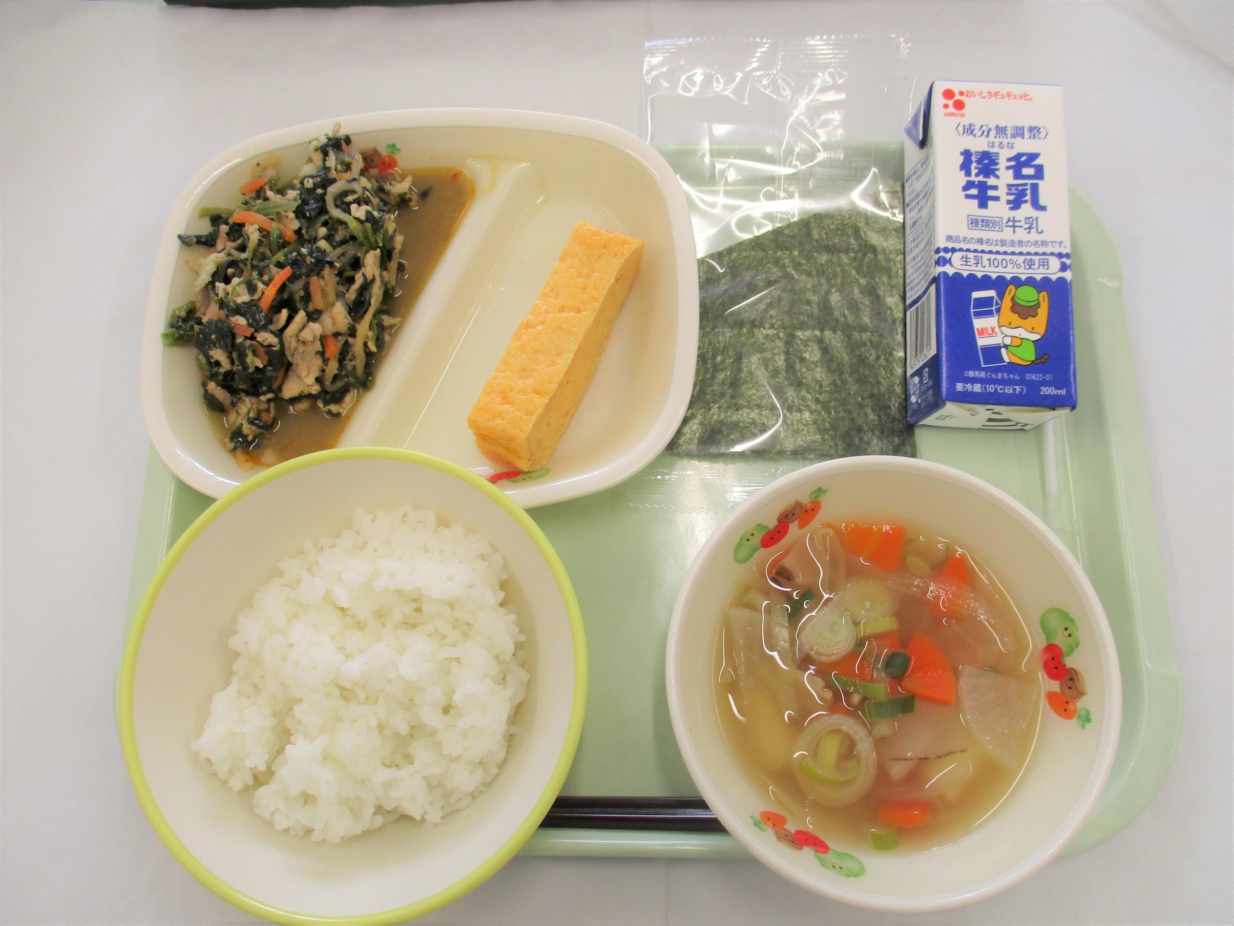 [受験生応援献立] ごはん 牛乳 豚カツソースがけ 塩昆布和え たぬき汁 いよかんゼリー | 18