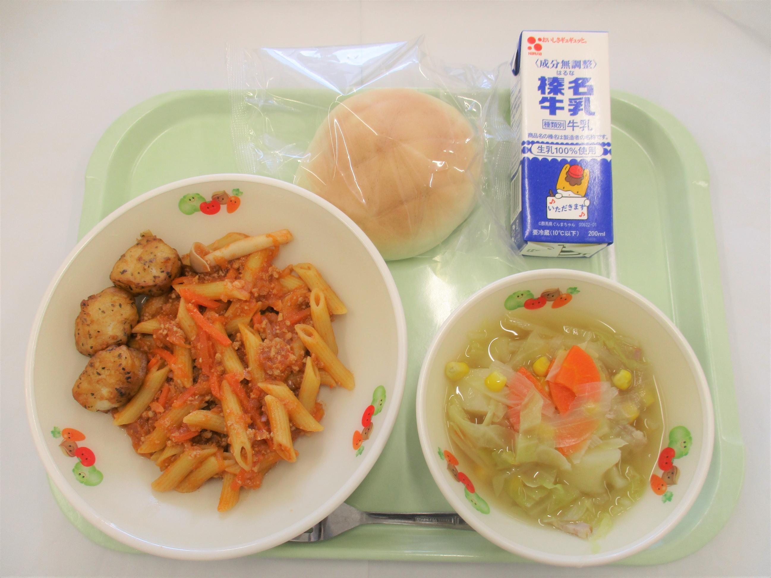 9 メロンパン 牛乳 鶏肉のレモンバジルナゲット ペンネのボロネーゼ コンソメスープ | 10 ごはん 牛乳 アジ塩麹竜田揚げ ひじきの五目煮 豆腐チゲスープ | 11