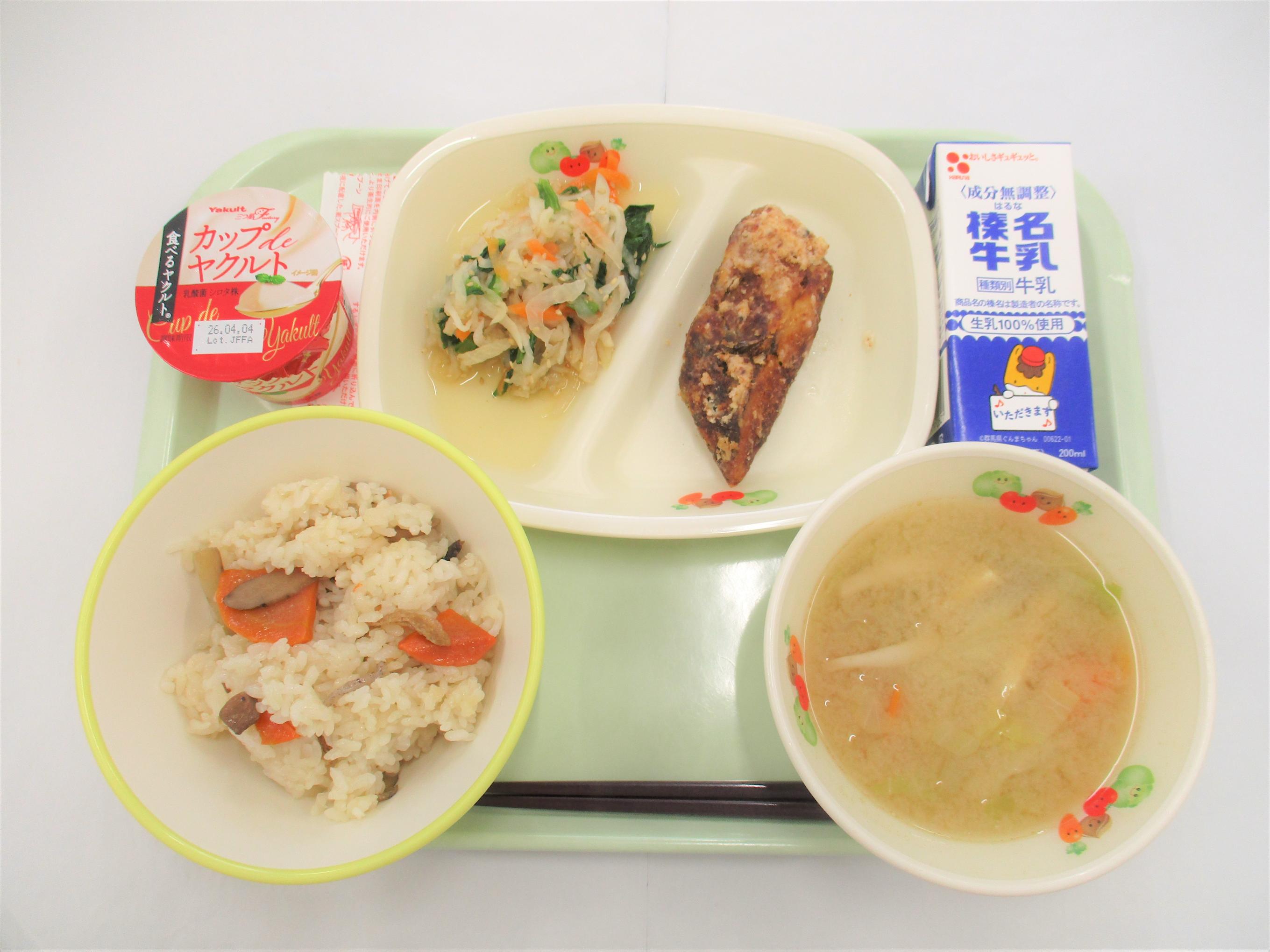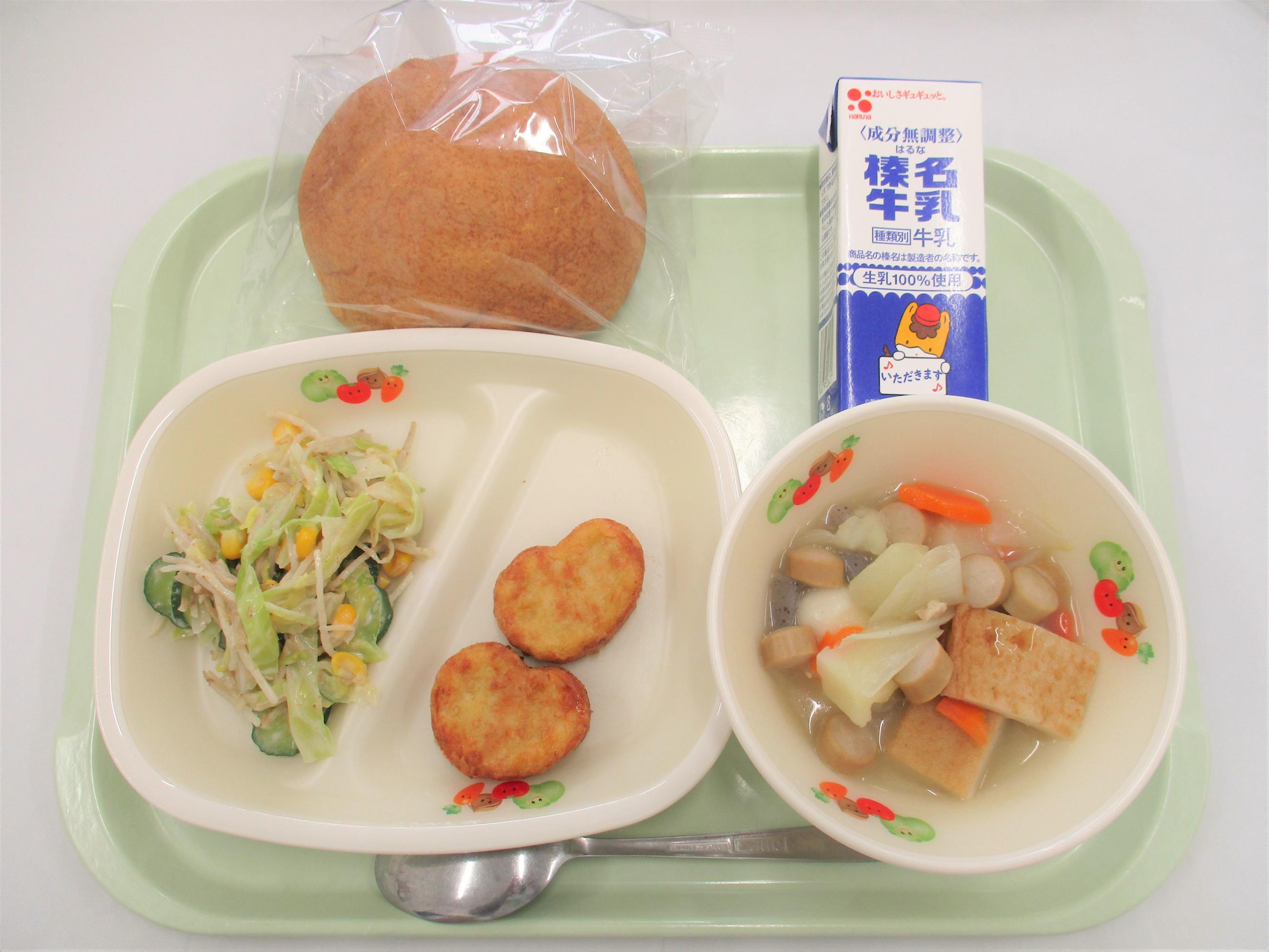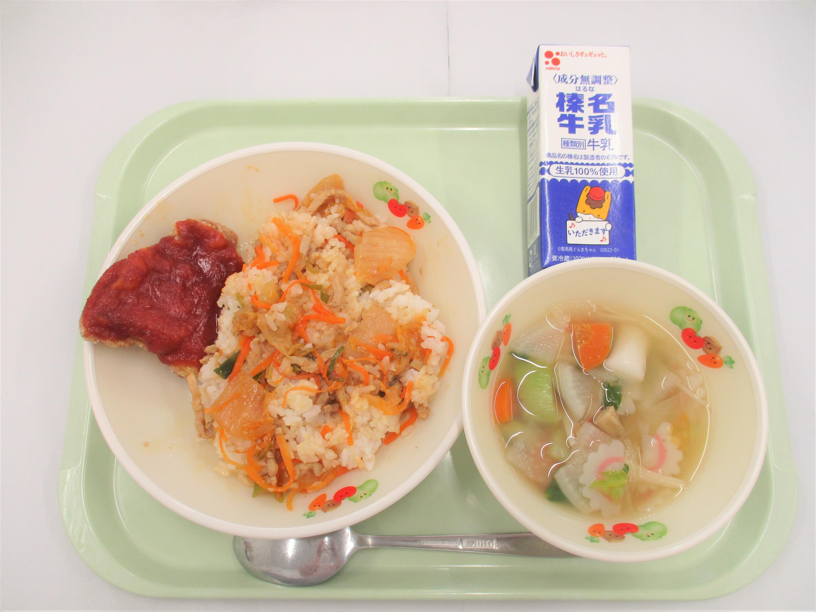 16 ロールパン ジョア(プレーン) ウインナー チリコンカン 野菜スープ | 17 ごはん 牛乳 豆腐ハンバーグおろしソース じゃがいものみそ煮 きのこ汁 | 18 バンズパン 牛乳 FMチキンナゲット ごぼうサラダ 洋風おでん | 19 [小学校卒業お祝い献立] 上州かみなりごはん 牛乳 さわら立田揚げ 切干大根のハリハリ漬け きゃべつとしめじのみそ汁 小:米粉と豆乳のいちごケーキ 中:クリーミーヨーグルト | 20