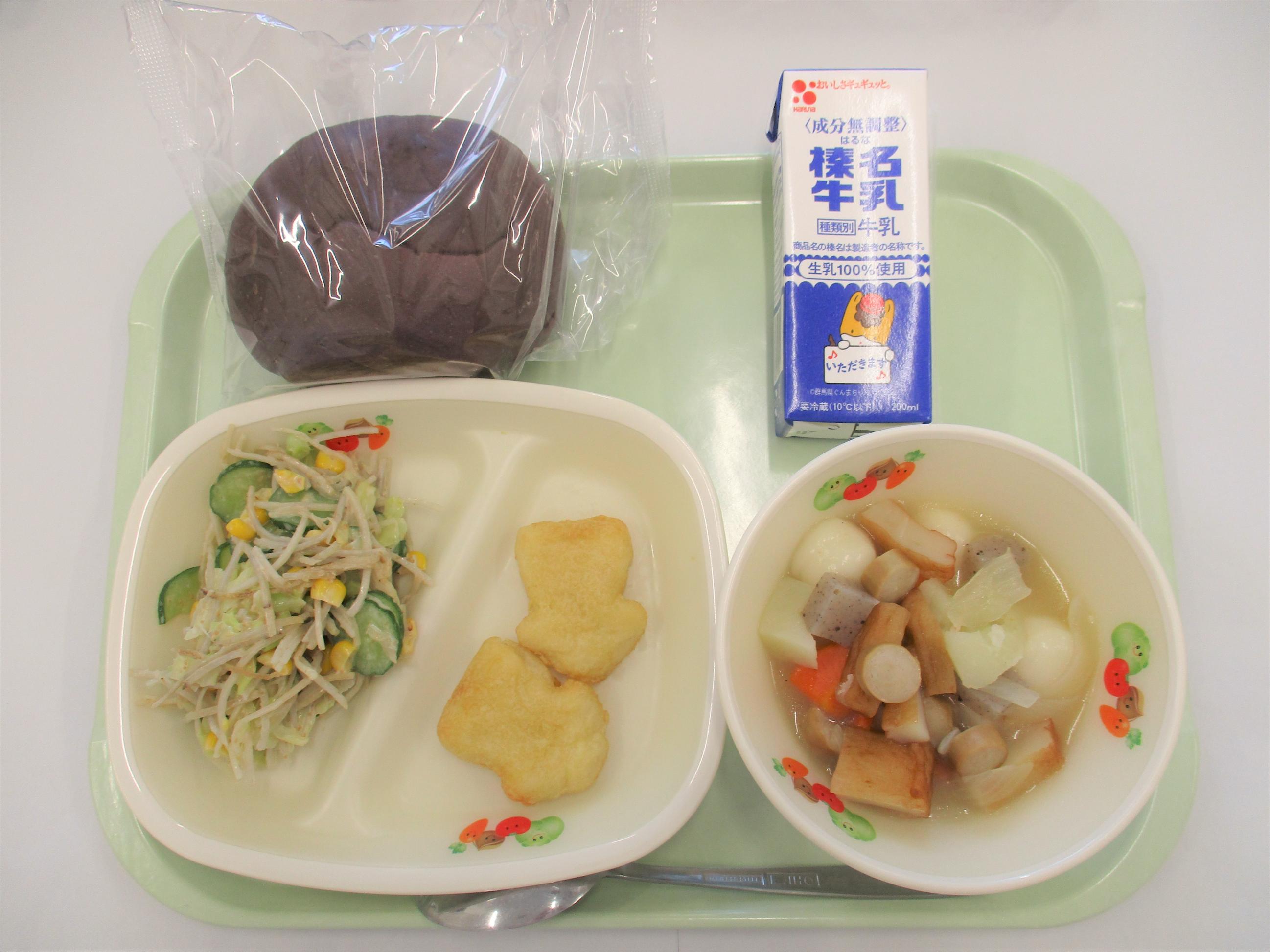 8 クロワッサン ジョア(プレーン) FMチキンナゲット スパゲティボロネーゼ 野菜スープ | 9 ごはん 牛乳 ホキの香味ソースがけ きざみ昆布の炒め煮 豚汁 のりふりかけ | 10 背割りコッペパン 牛乳 小:ウインナー 中:ロングウインナー コーンサラダ ホタテの豆乳スープ | 11 ごはん 牛乳 照り焼きハンバーグ 切干大根の炒め煮 野菜のみそ汁 | 12 麦ごはん 牛乳 ぷちぷちサラダ 冬野菜カレー いちごゼリー |