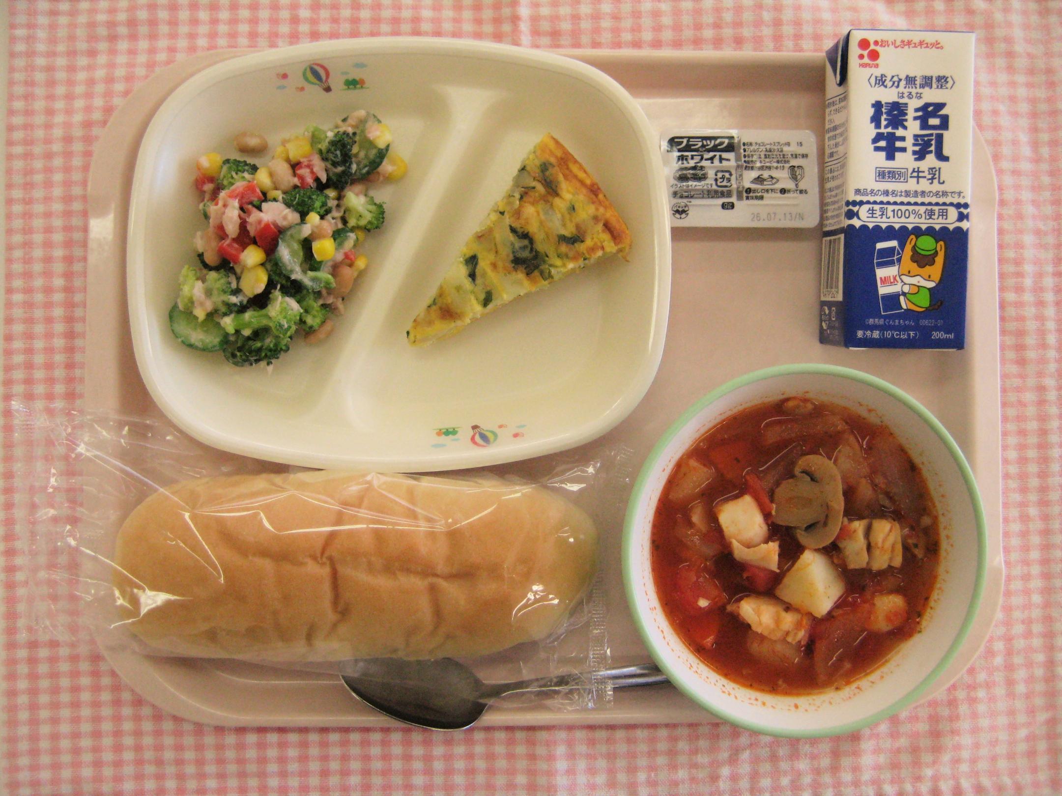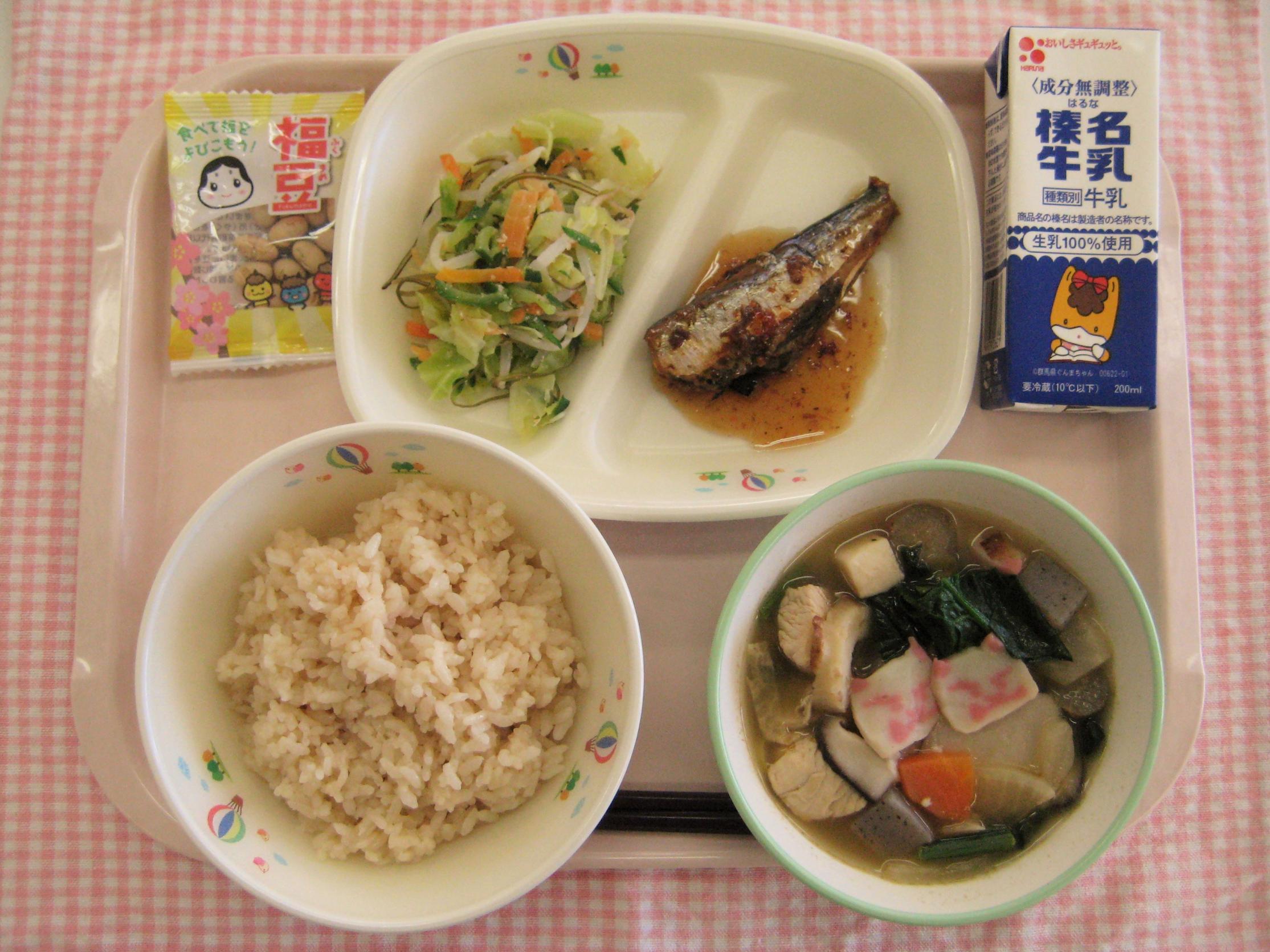 2 ごはん 牛乳 しぶせんシュウマイ チャーハンの具 スンドゥブ風スープ | 3 【行事食:節分】 さくらごはん 牛乳 いわしの梅煮 ごま昆布あえ けんちん汁 福豆 | 【世界の料理:スペイン】 ソフトフランス ブラック&ホワイトチョコクリーム 牛乳 スペイン風オムレツ エンペドラッド ソパ・デ・アホ | 5 【金島中学校3年生リクエスト献立】 ごはん 牛乳 かぼちゃひき肉フライ 上州きんぴら なめこのみそ汁 | 6 メロンパン 牛乳 たこナゲット 白菜のクリーム煮 えびボールスープ |