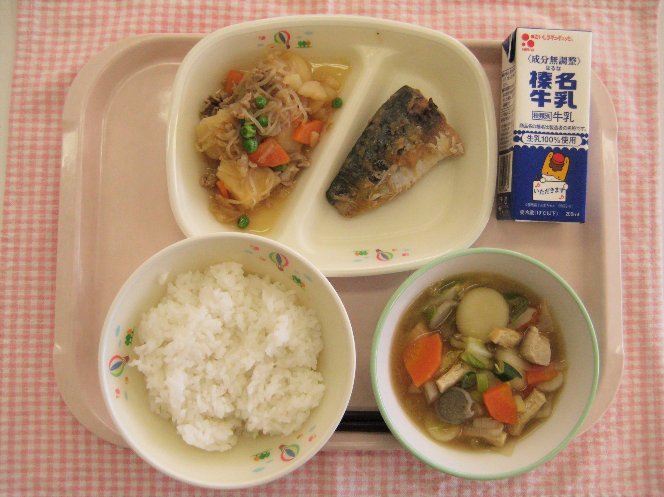 9 【子持中学校3年生リクエスト献立】 ごはん 牛乳 さばのみそ煮 肉じゃが つみっこ | 10 わかめごはん 牛乳 とりの照り焼き キムチあえ 小野上っ子とん汁 | 11 建国記念の日