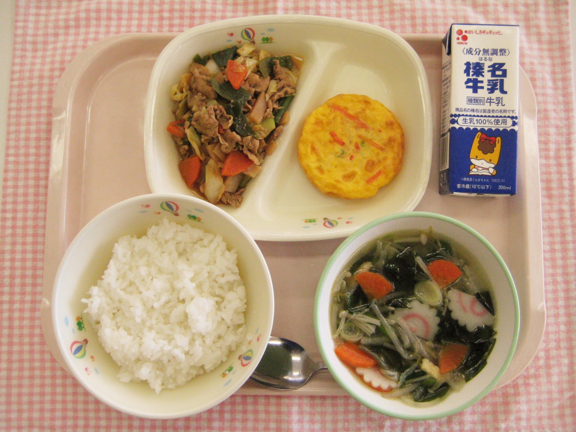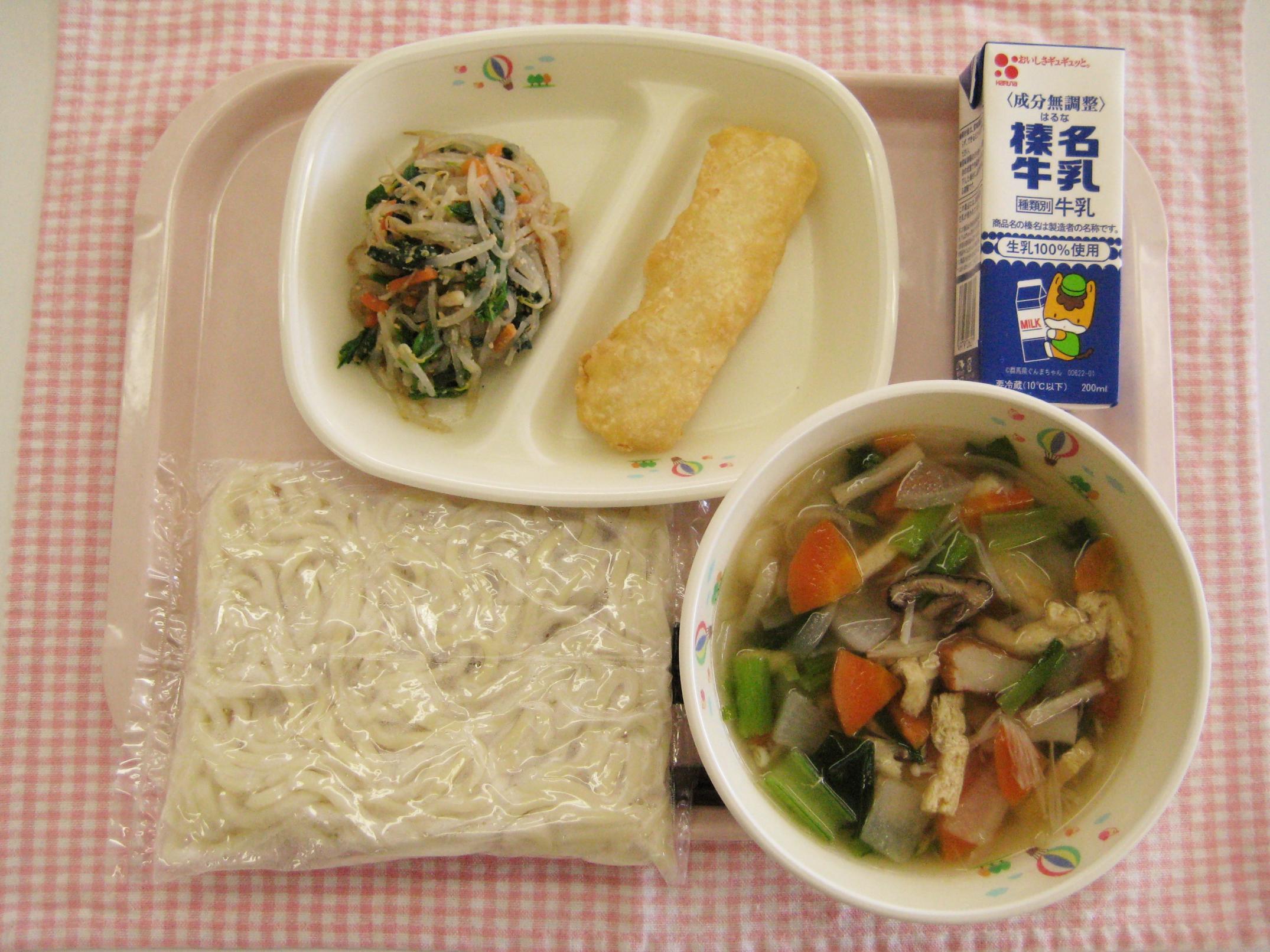 | 12 ごはん 牛乳 コーヒー牛乳のもと フヨウハイ 回鍋肉 大根の中華スープ | 13 パックうどん 牛乳 いかの天ぷら しらたきのごまあえ きつねうどん汁 |