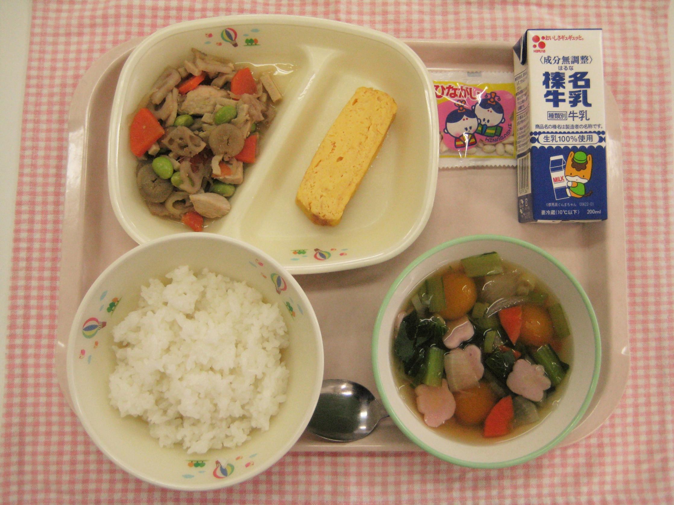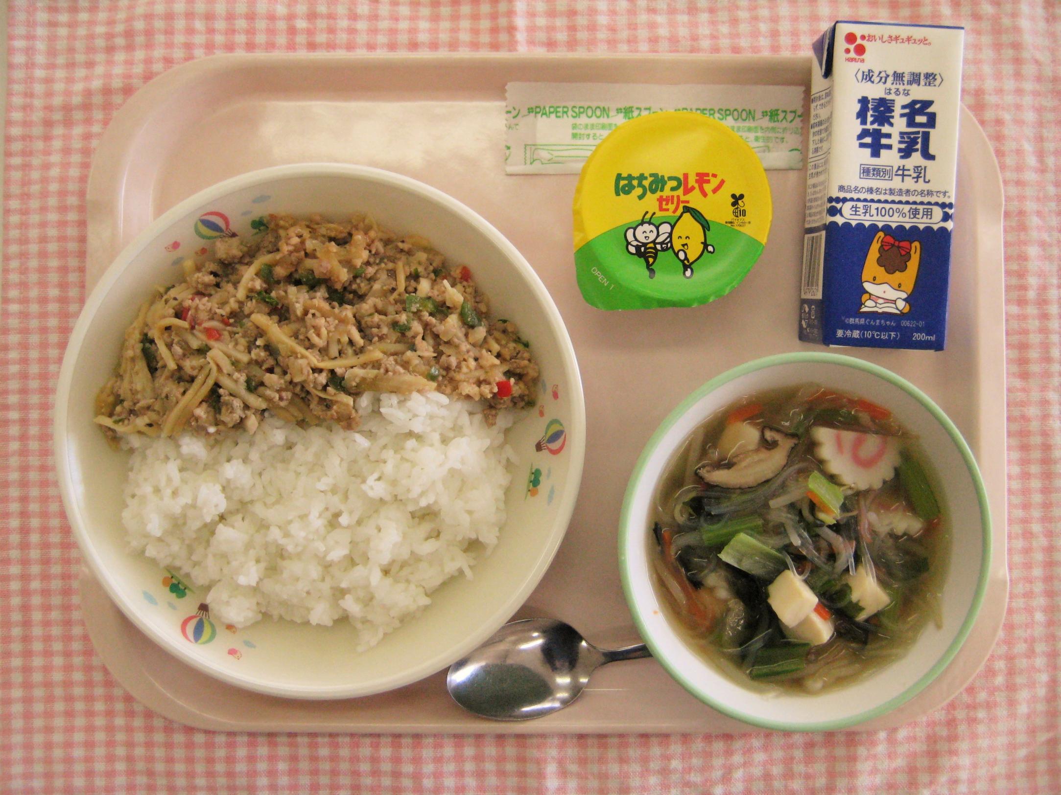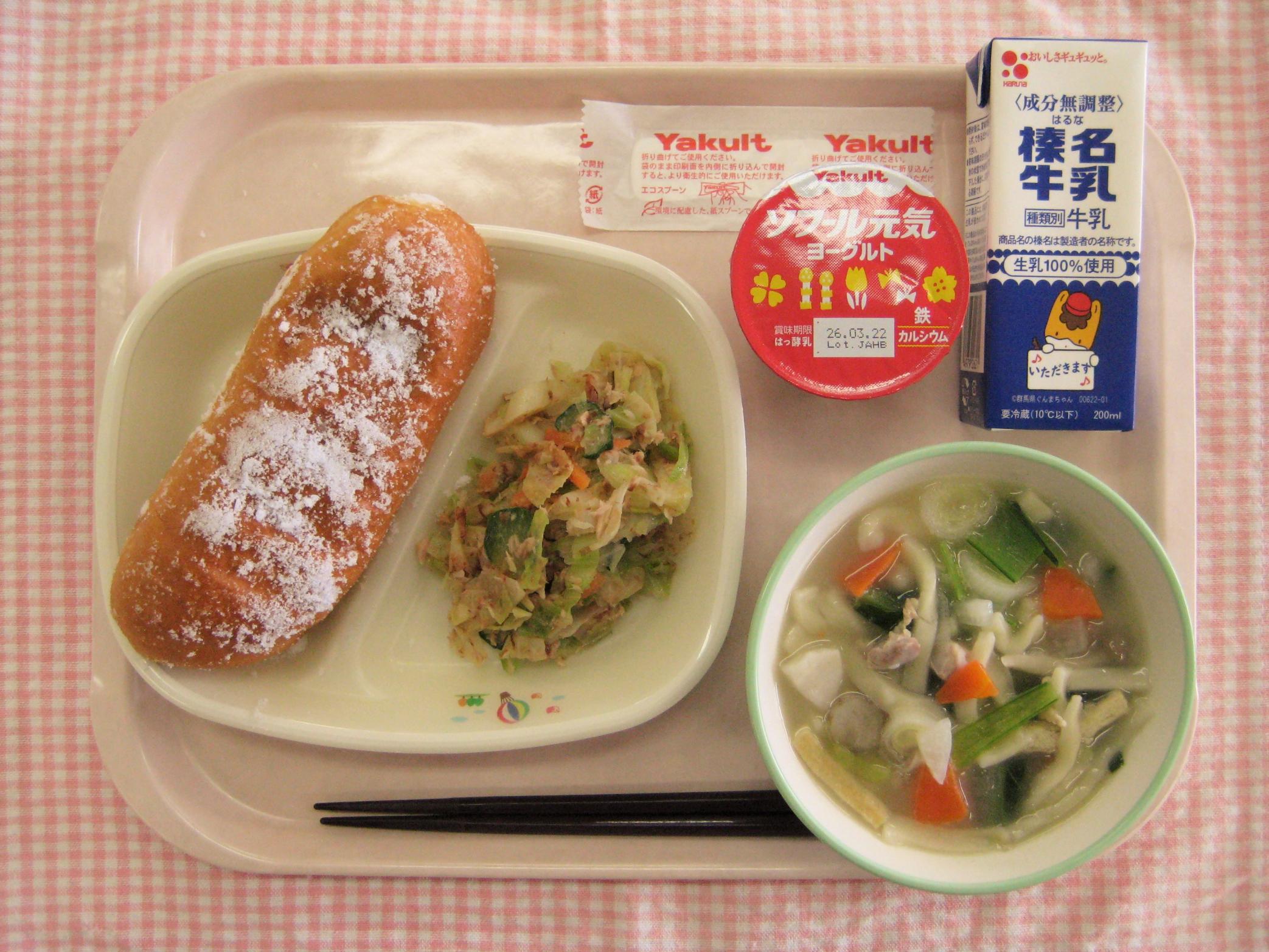 2 ごはん 牛乳 ガパオライスの具 春雨スープ はちみつレモンゼリー | 3 【行事食:ひなまつり】 ごはん 牛乳 厚焼き卵 五目ご飯の具 かぼちゃ団子のすまし汁 ひなあられ | チョコチップパン 牛乳 いかナゲット ごぼうサラダ ミネストローネ | 5 ごはん 牛乳 みそだれ焼き肉 焼き芋 けんちん汁 | 6 【中学3年生リクエスト献立】 シュガー揚げパン 牛乳 和風サラダ 煮込み水沢うどん ヨーグルト |