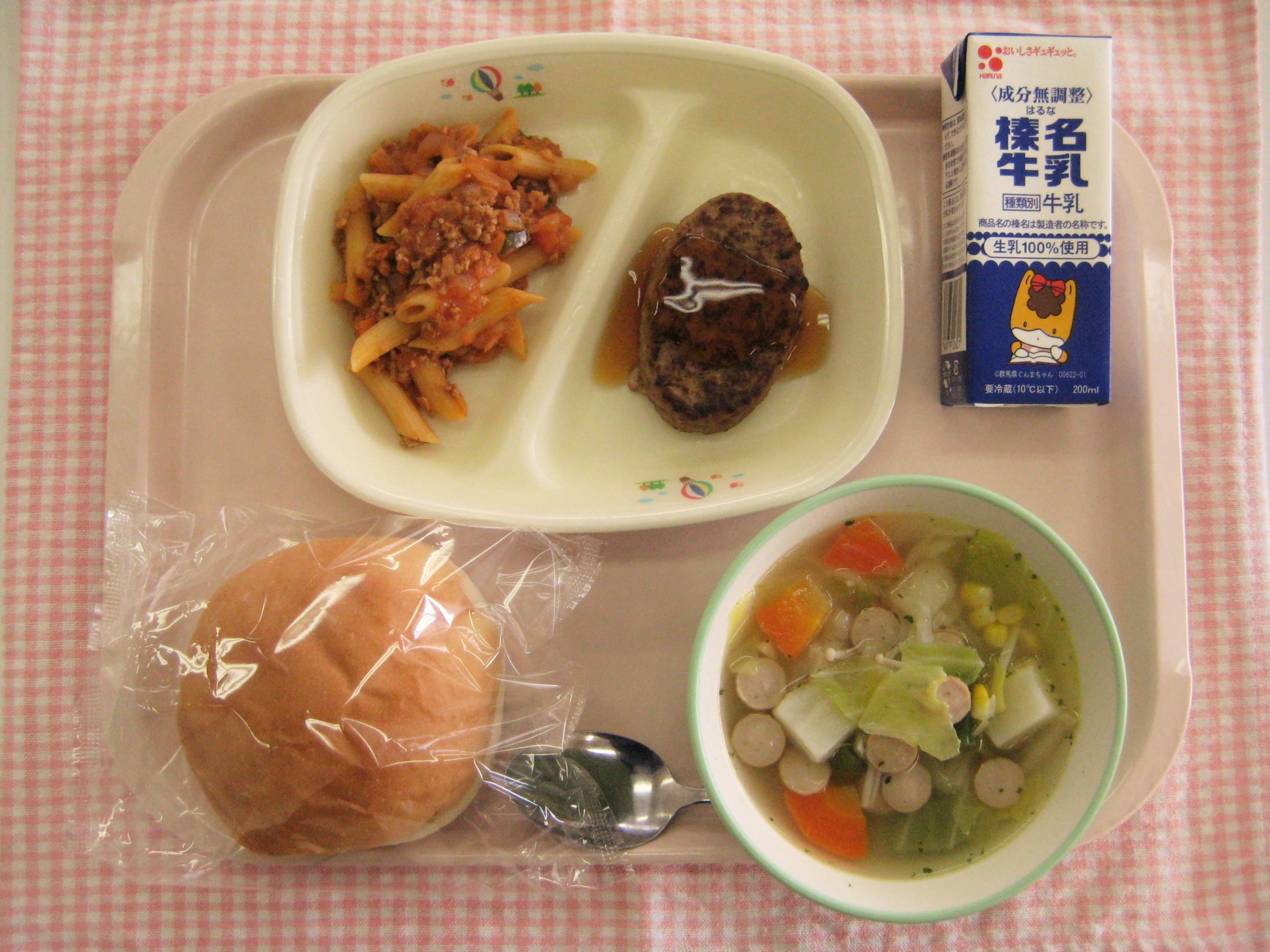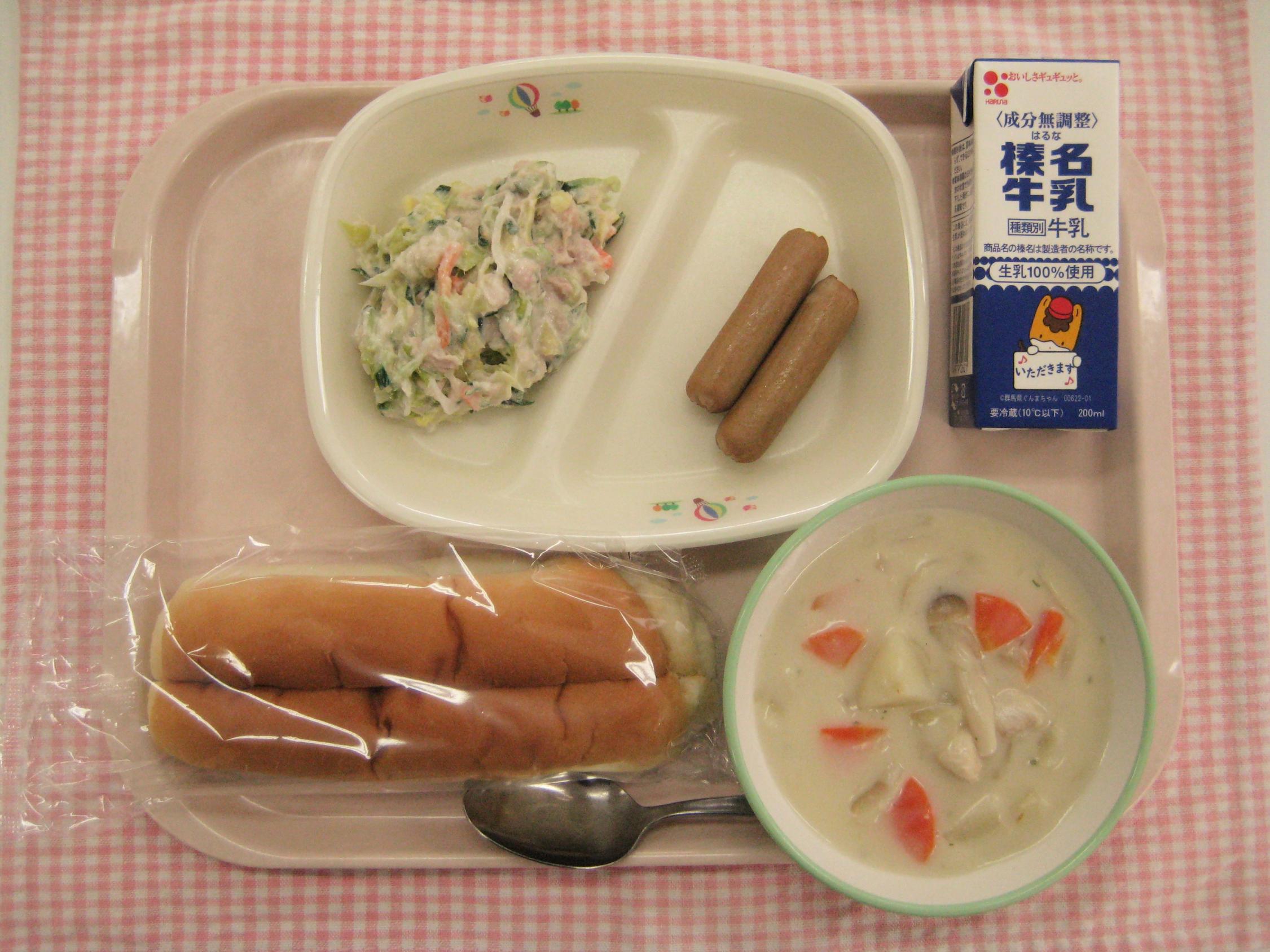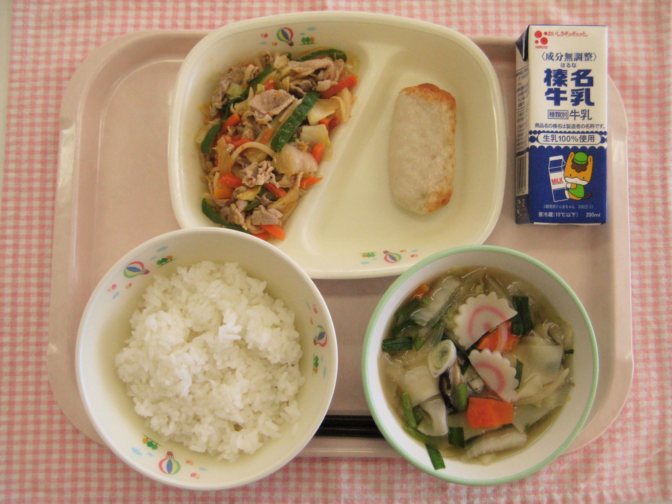 16 パックラーメン 牛乳 ぎょうざ 肉野菜炒め ちゃんぽんラーメンスープ | 17 【郷土料理:宮城県】 わかめごはん 牛乳 さばのカレー風味焼き お煮しめ はっと汁 | 18 背割れこめっこぱん 牛乳 ウインナー ツナサンドの具 クリームシチュー | 19
