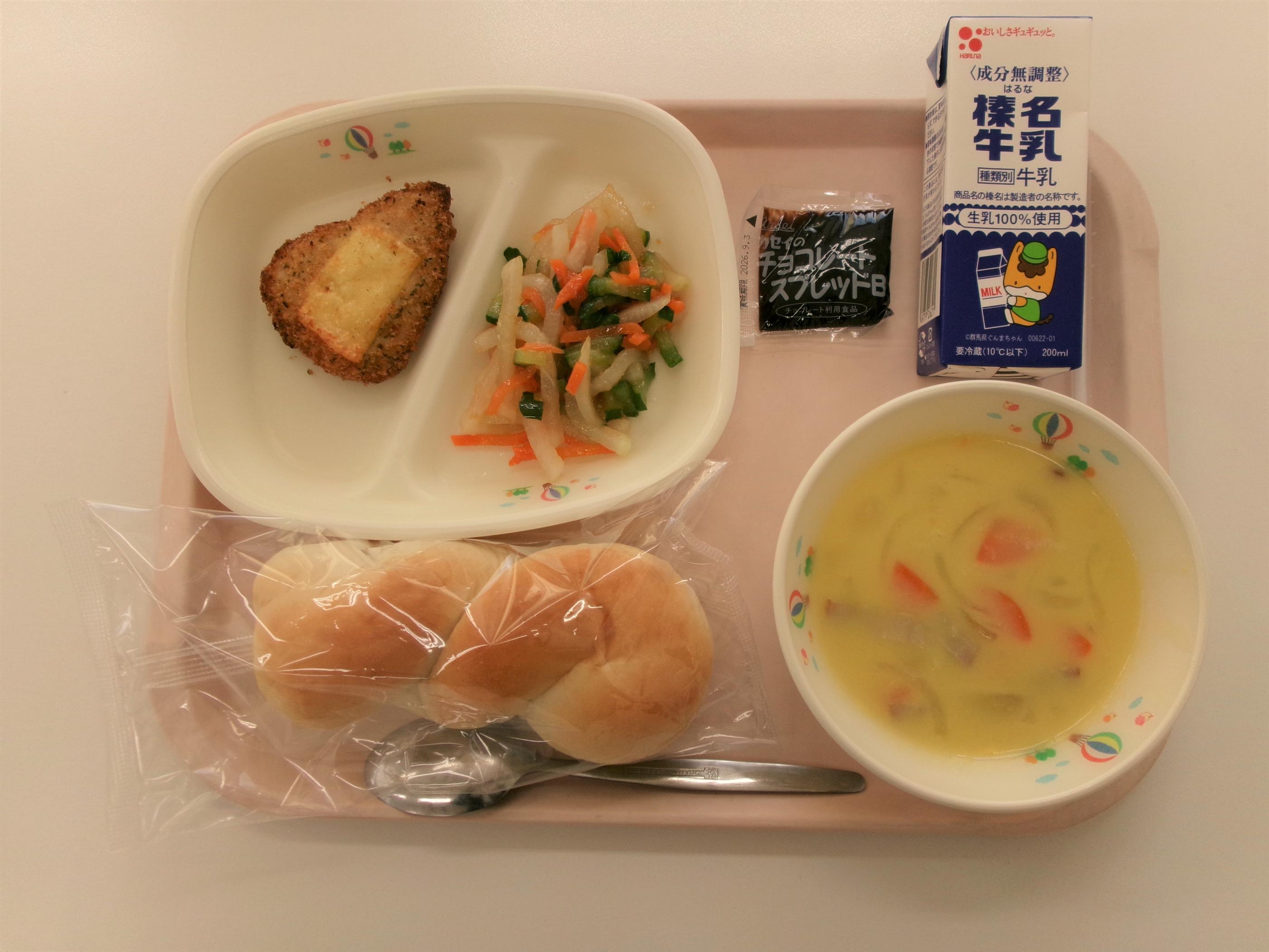 16 ごはん 牛乳 コーンシューマイ スタミナ炒め丼の具 わかめスープ | 17 黒パン ジョア(プレーン) なすトマトグラタン ふわふわ卵のスープ ジャーマンポテト | 18 ~かみかみ献立~ ごはん 牛乳 かぼちゃひき肉フライ鶏団子みそ汁 五目きんぴら | 19 ラーメン☆パックめん 牛乳 焼き餃子 みそラーメンスープ チキン中華サラダ | 20 春分の日 |