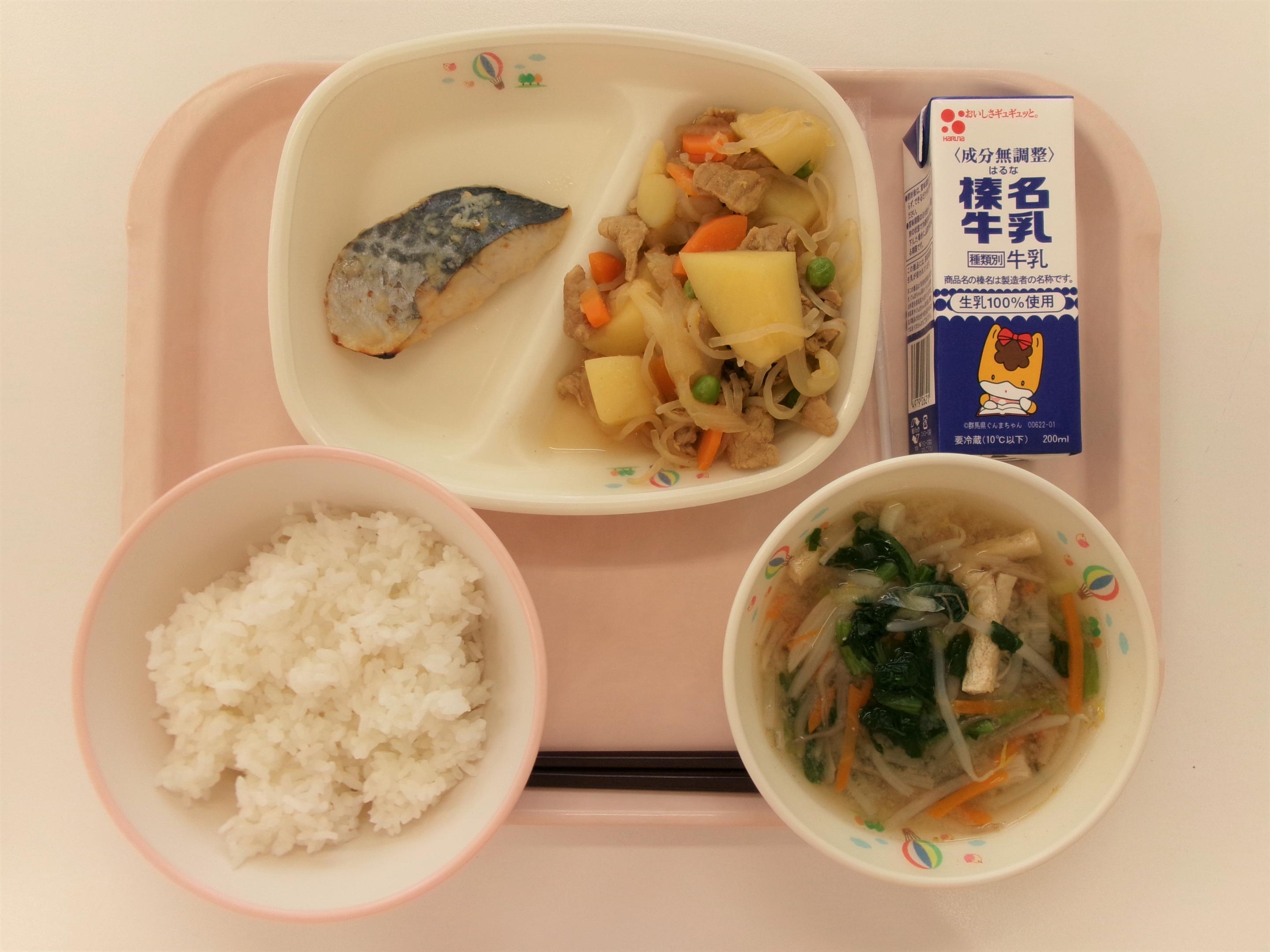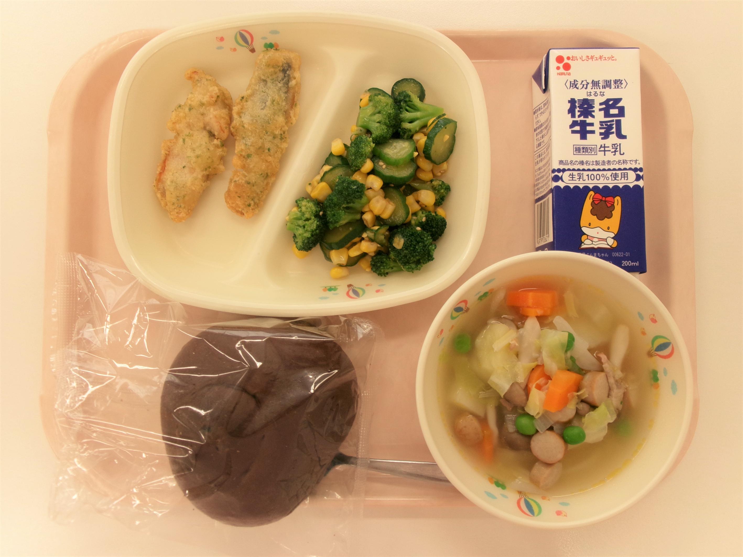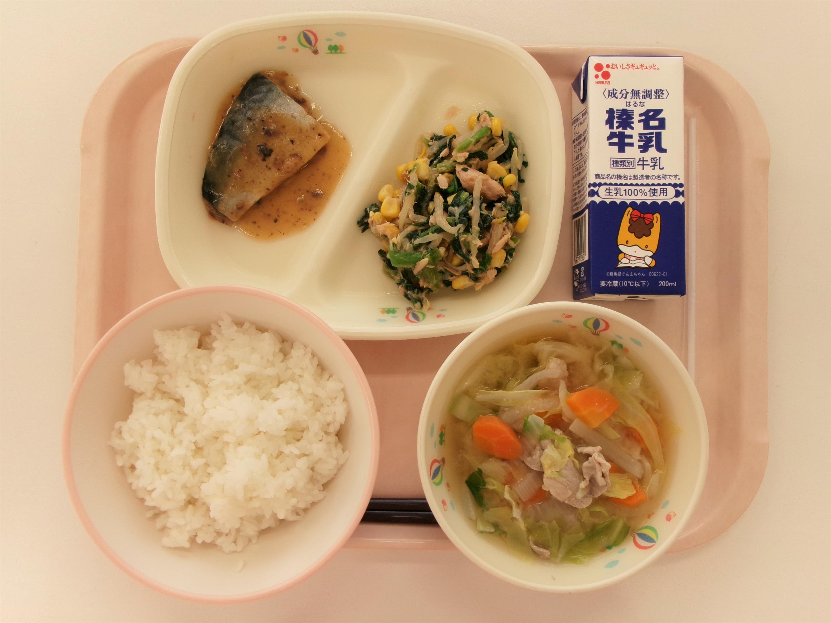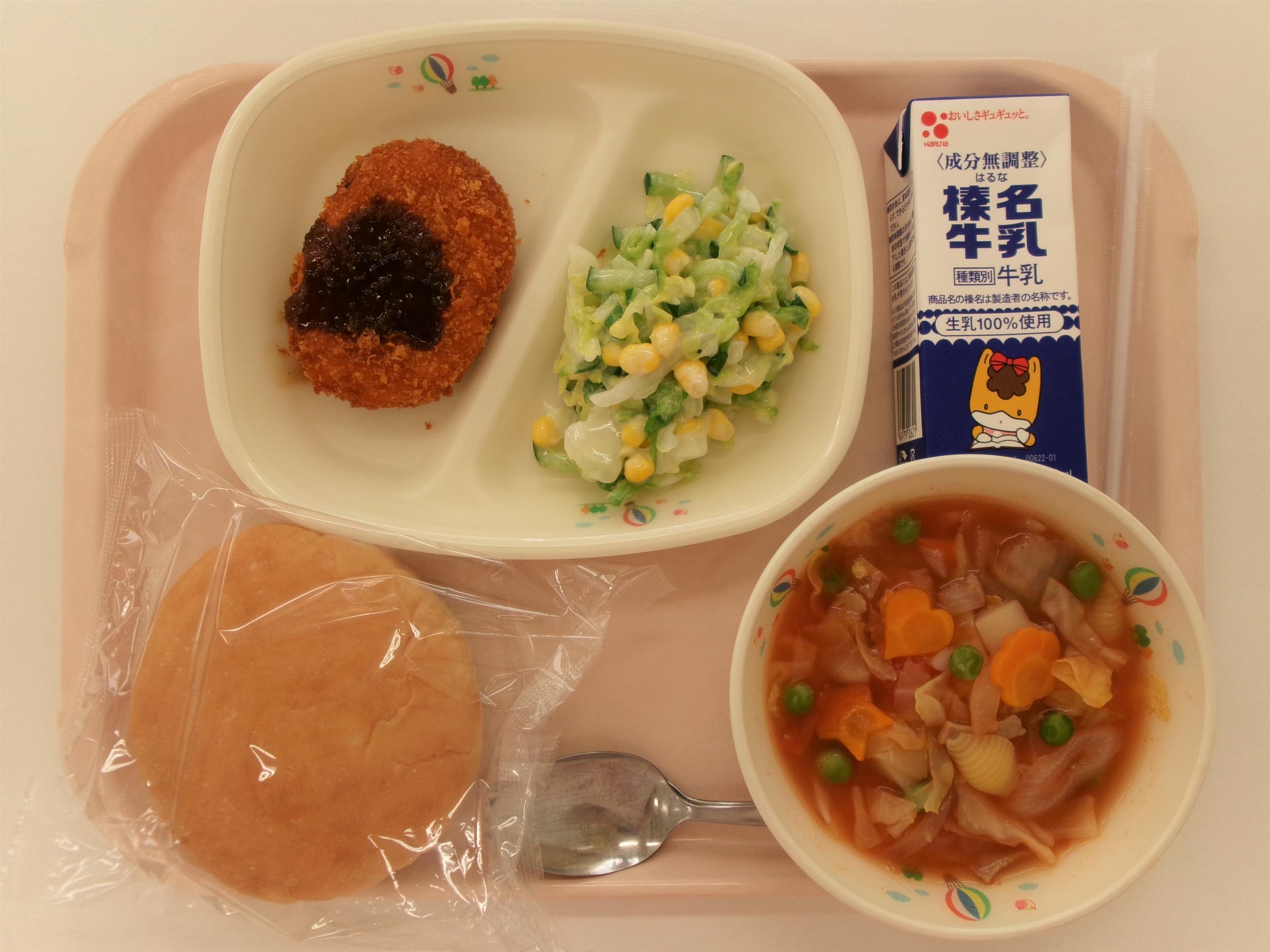 13 ごはん 牛乳 赤魚の白醤油焼き もやしと玉ねぎのみそ汁 じゃがいもの生姜煮 | 14 丸パン横切り 牛乳 野菜コロッケソースがけ ミネストローネ コールスローサラダ | 15 ごはん 牛乳 コーンしゅうまい 春雨スープ ひき肉とたけのこのあんかけ | 16 うどん☆パックめん 牛乳 ちくわの磯辺揚げ 五目うどん汁 ほうれん草のごまあえ | 17 ごはん 牛乳 さばのみそ煮 キャベ豚汁 小松菜のツナあえ |