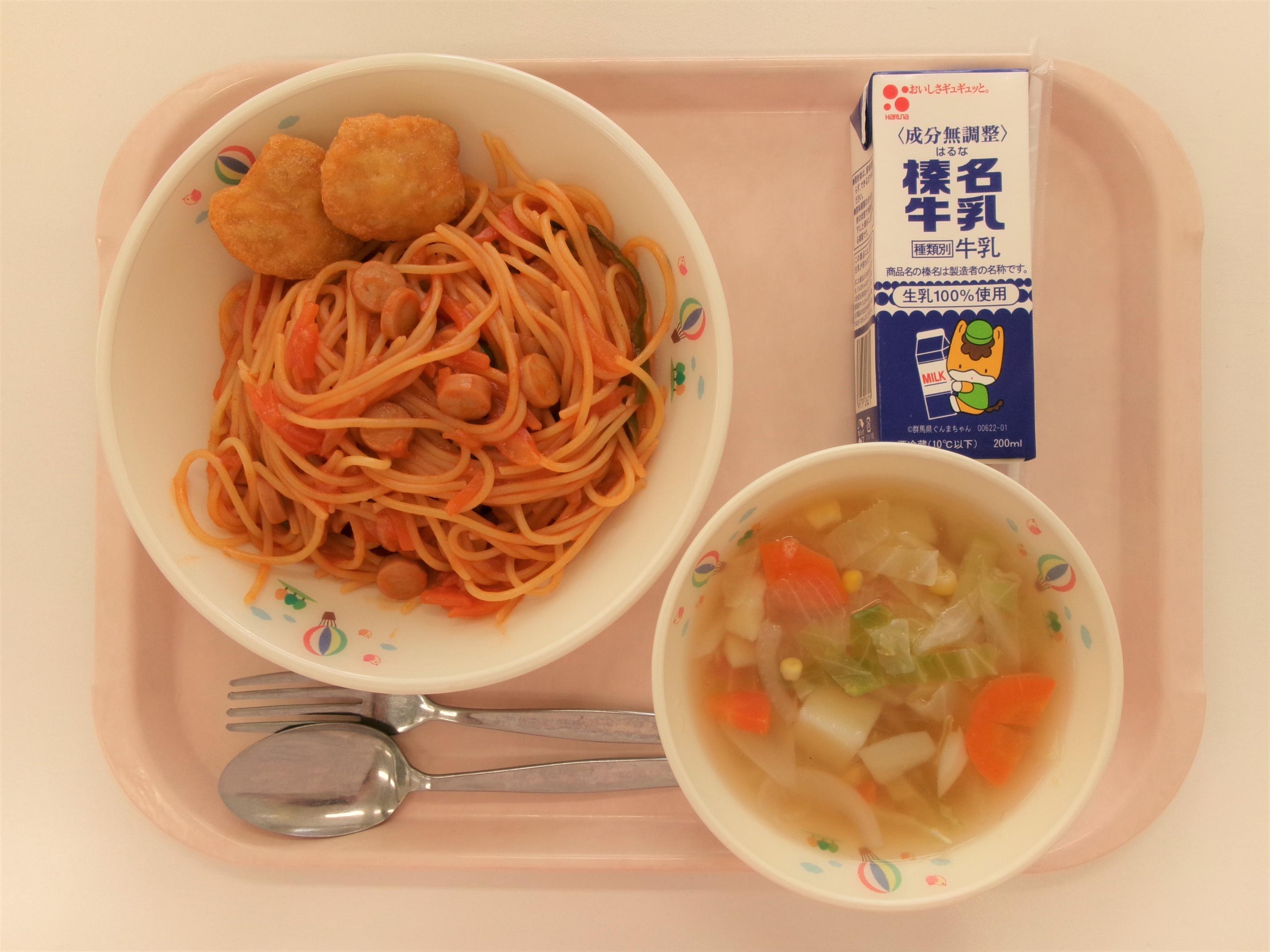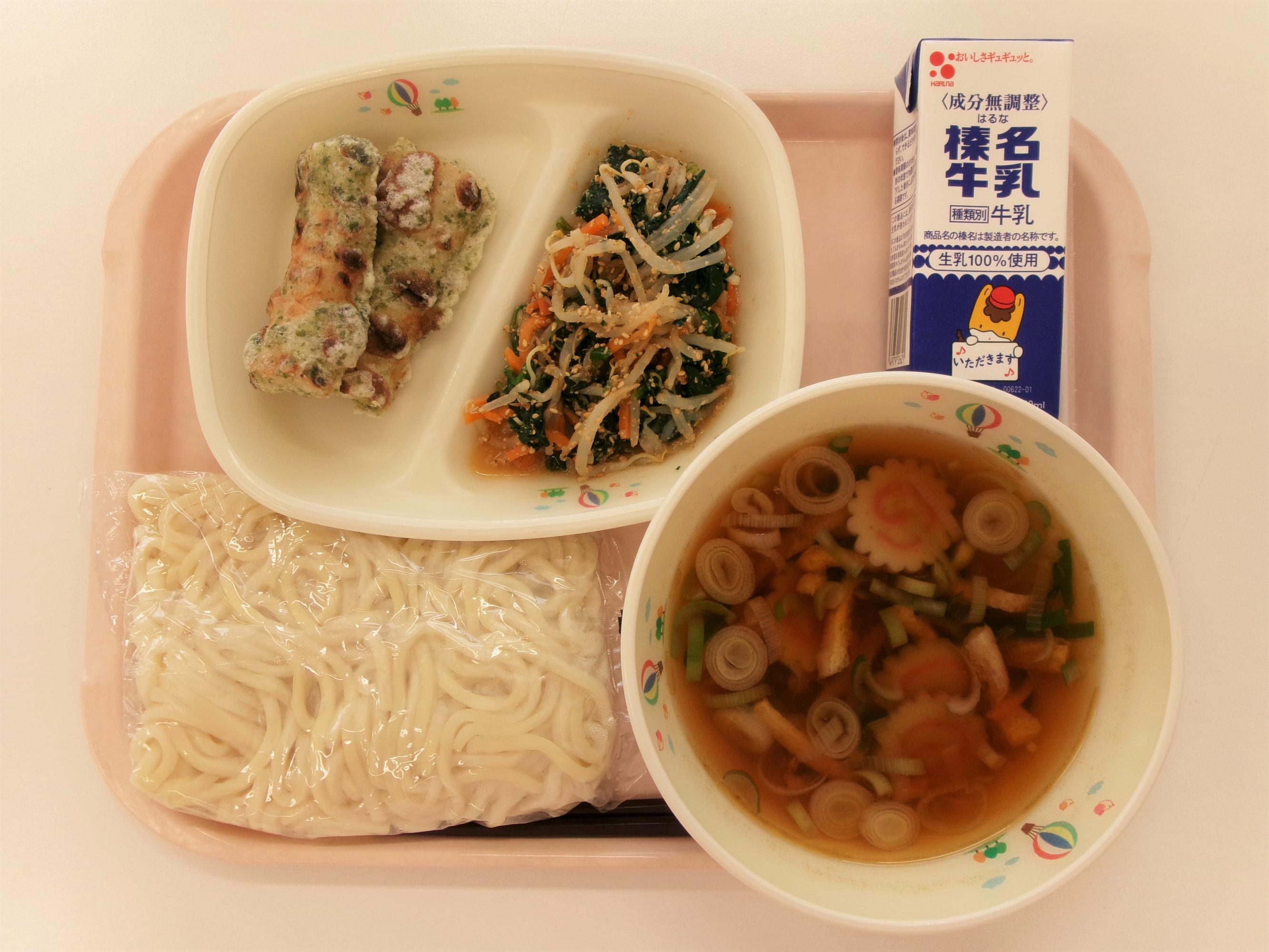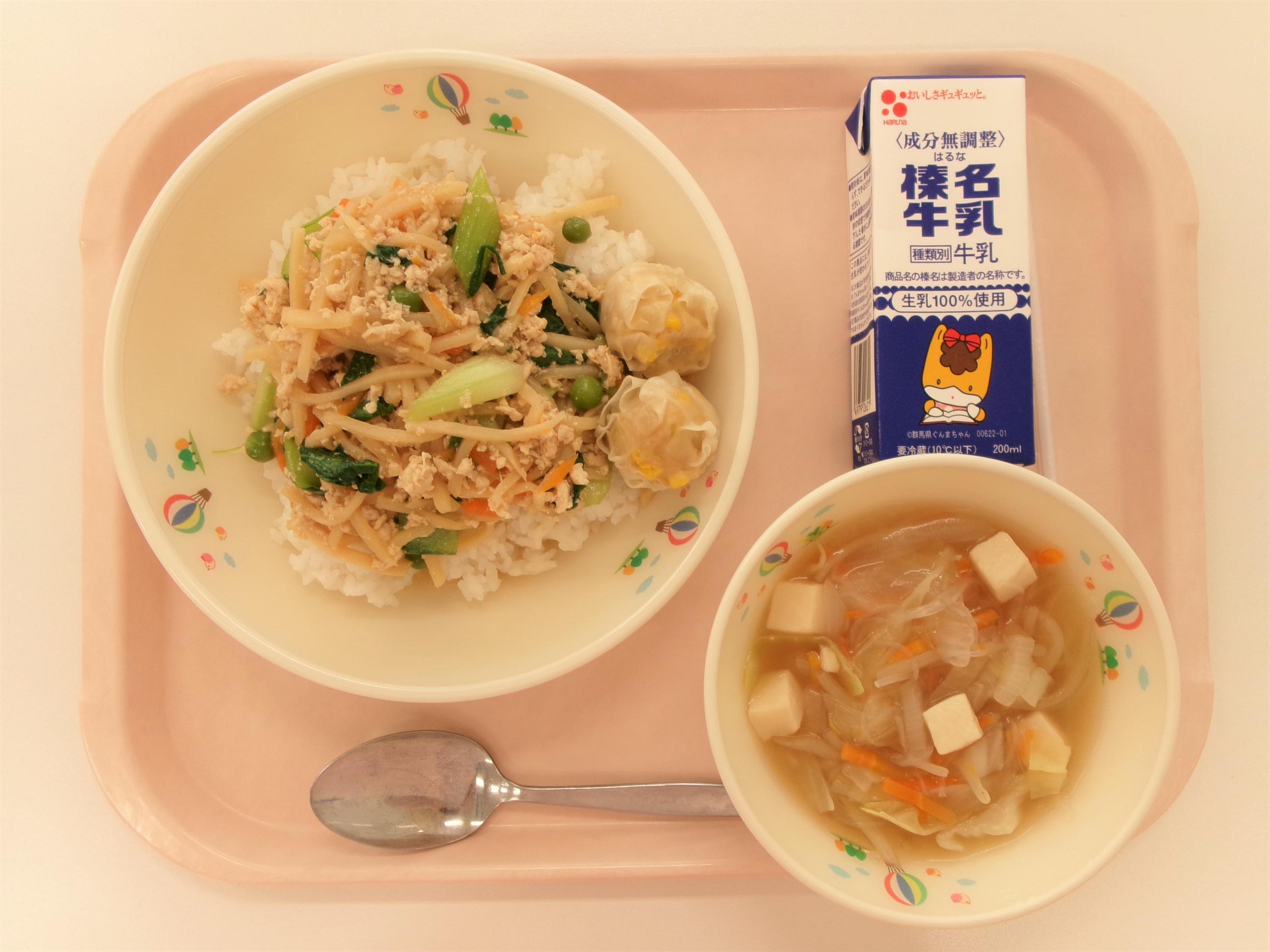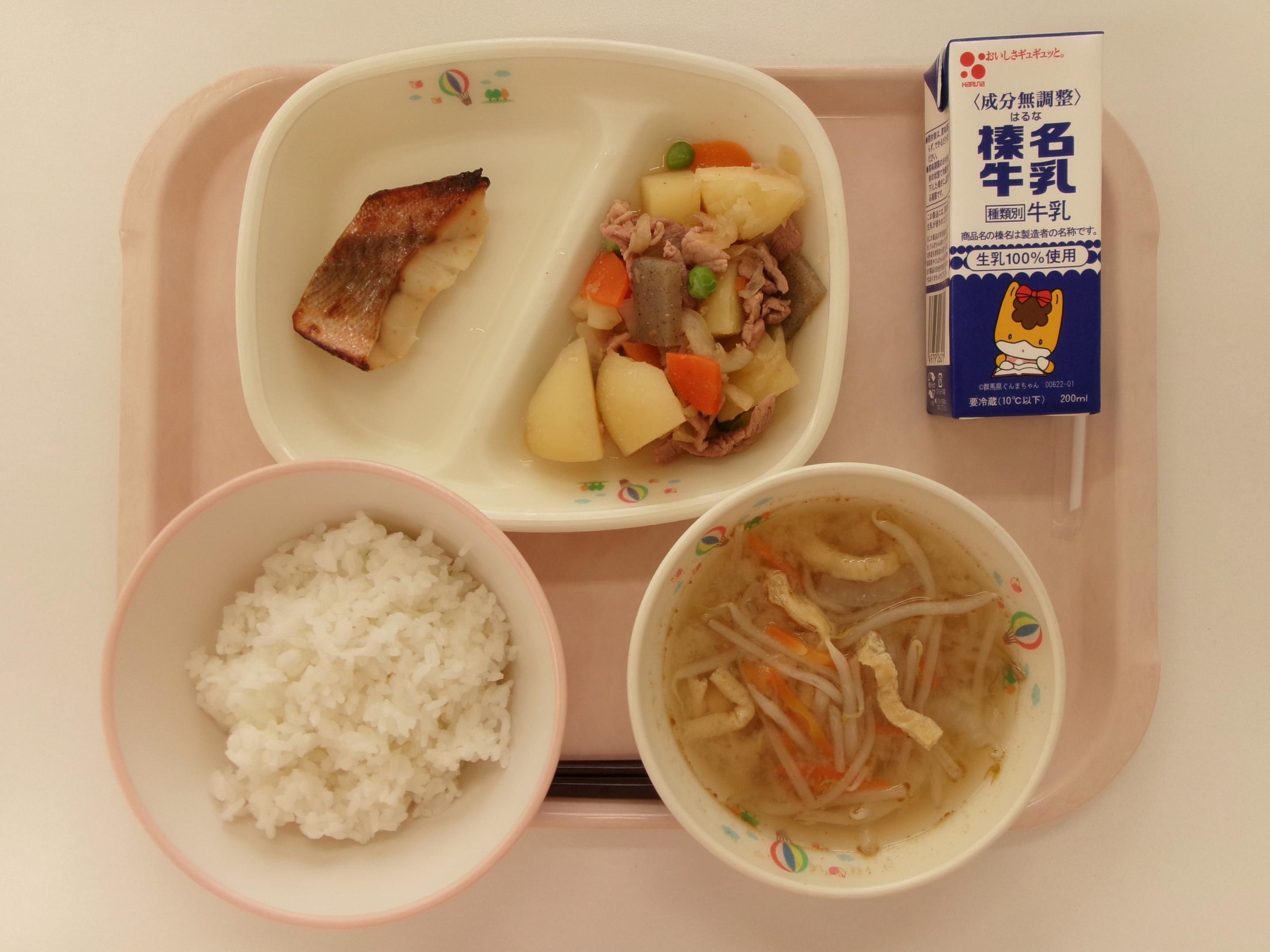 13 ごはん 牛乳 赤魚の白醤油焼き もやしと玉ねぎのみそ汁 じゃがいもの生姜煮 | 14 丸パン横切り 牛乳 野菜コロッケソースがけ ミネストローネ コールスローサラダ | 15 ごはん 牛乳 コーンしゅうまい 春雨スープ ひき肉とたけのこのあんかけ | 16 うどん☆パックめん 牛乳 ちくわの磯辺揚げ 五目うどん汁 ほうれん草のごまあえ | 17 ごはん 牛乳 さばのみそ煮 キャベ豚汁 小松菜のツナあえ |