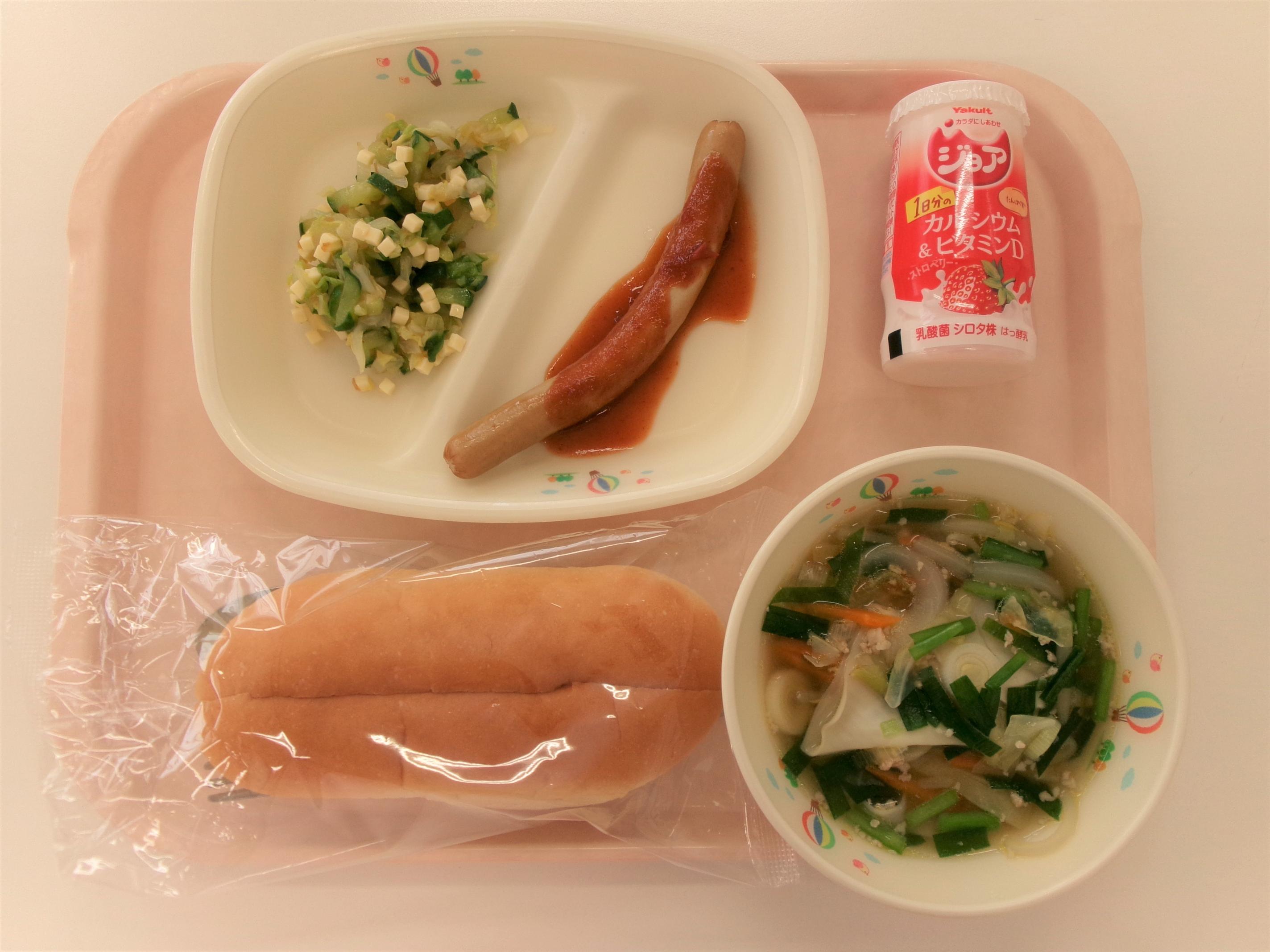 | 21 ~カルシウムアップ献立~ 背割りコッペパン ジョアストロベリー ロングウインナーケチャップ ワンタンスープ チーズサラダ