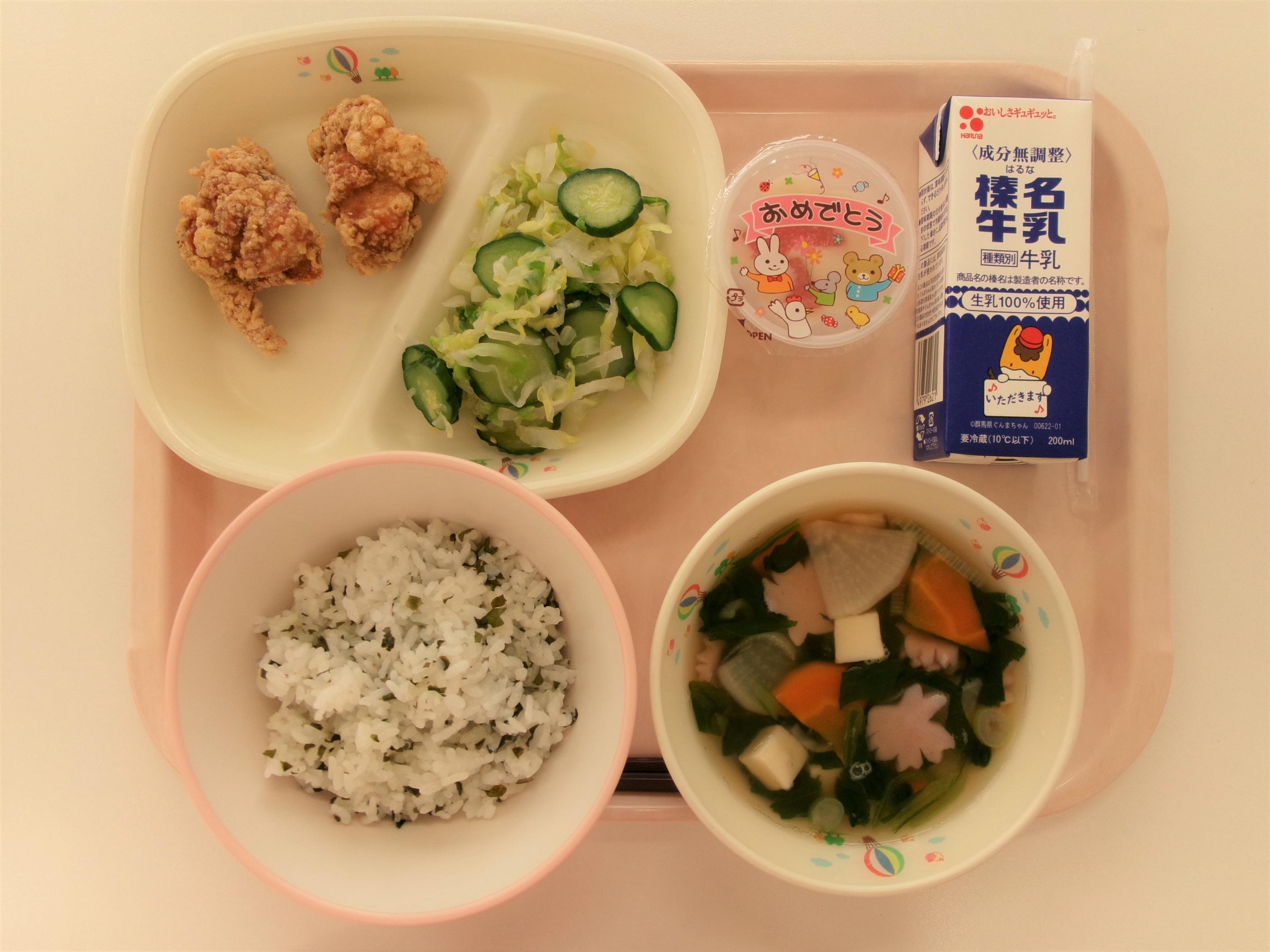 | 22 ごはん 牛乳 さわらの西京焼き もやしのみそ汁 カレー肉じゃが | 23 ココアパン 牛乳 あじフリッター 春野菜のポトフ コーンサラダ | 24 ~入学・進級お祝い献立~ わかめごはん 牛乳 鶏のから揚げ 桜かまぼこのすまし汁 香味漬け お祝いゼリー
