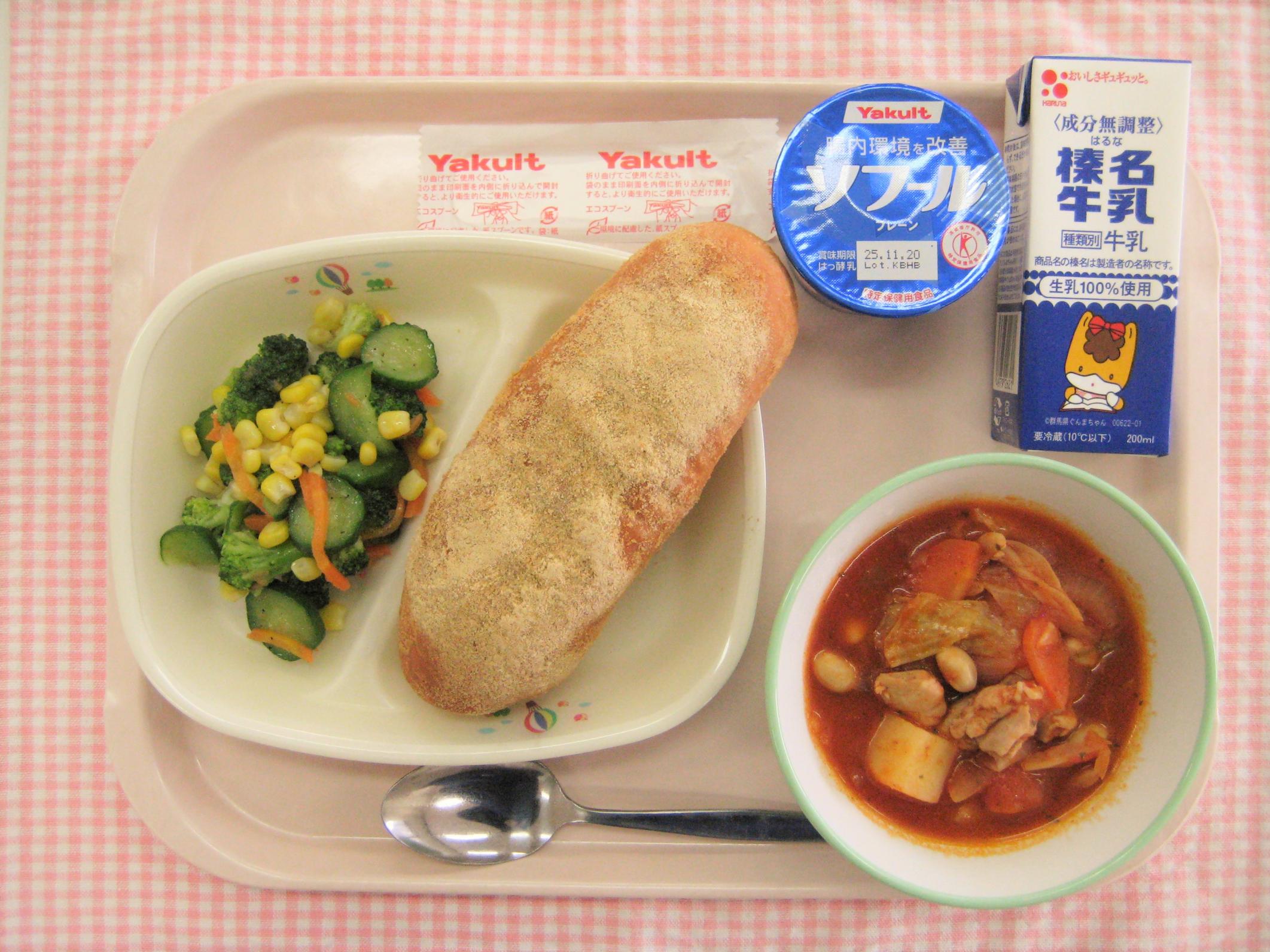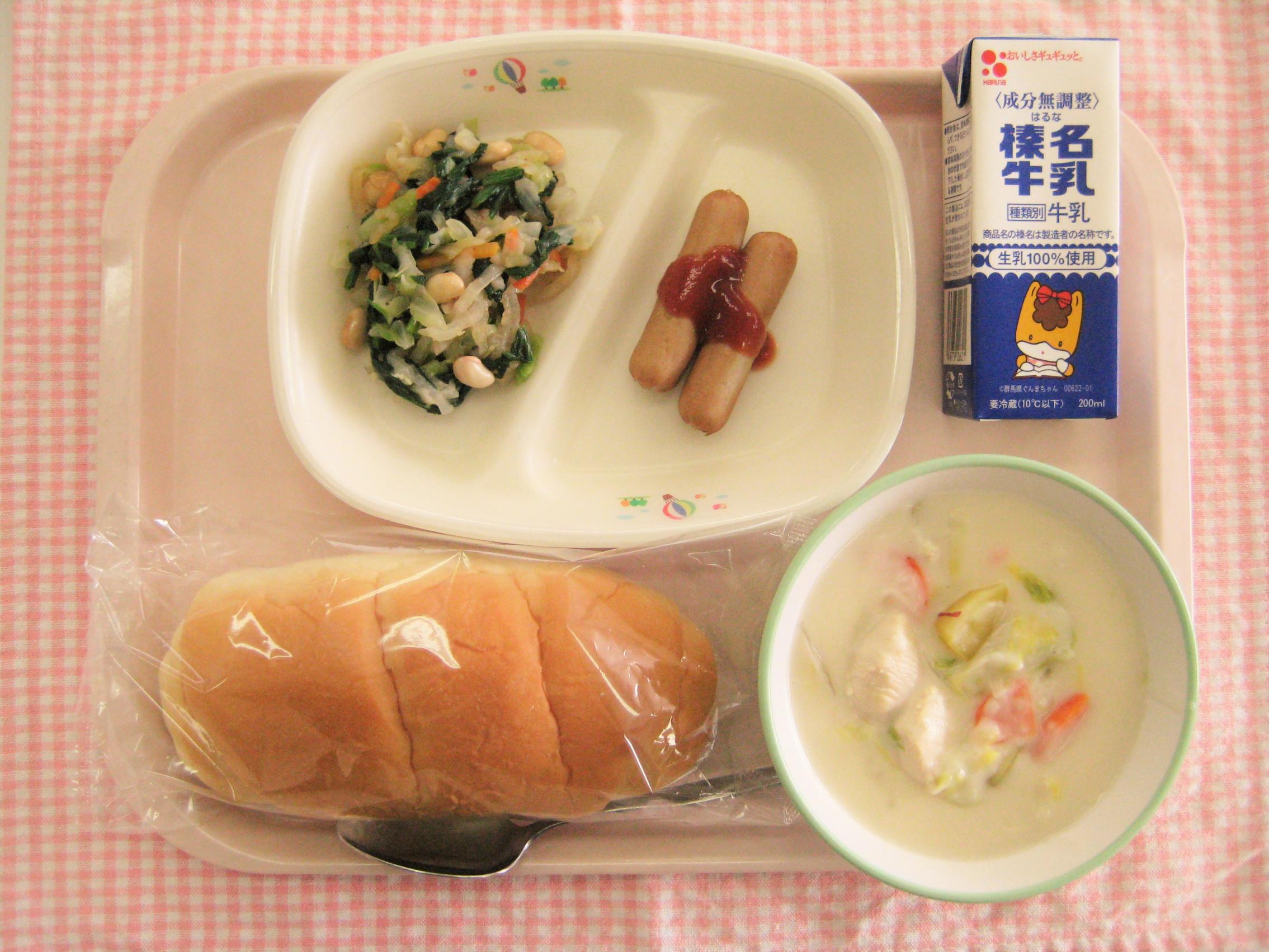 14 ゆめロール 牛乳 ウインナーソースかけ 青菜と大豆のサラダ オータムシチュー