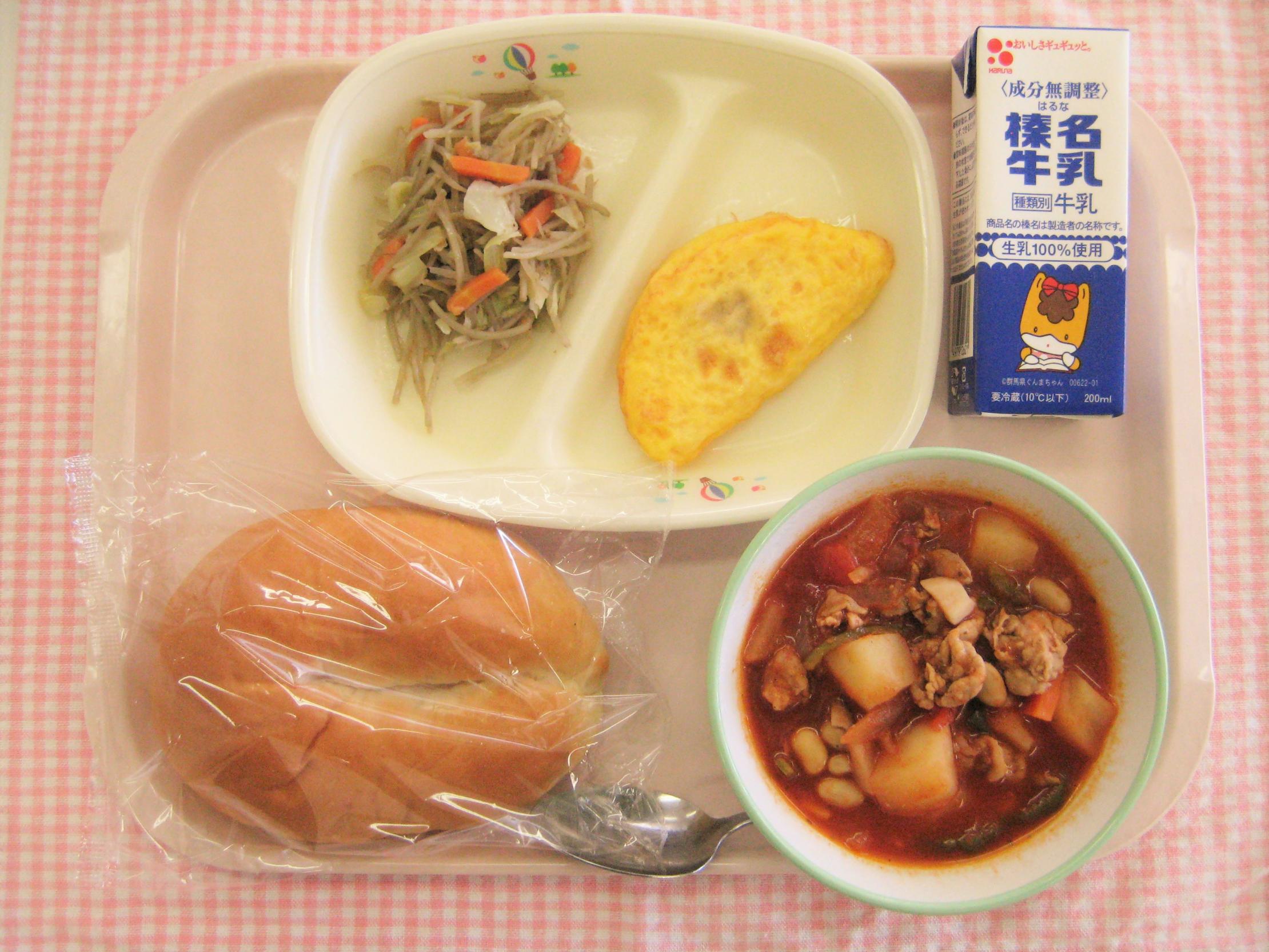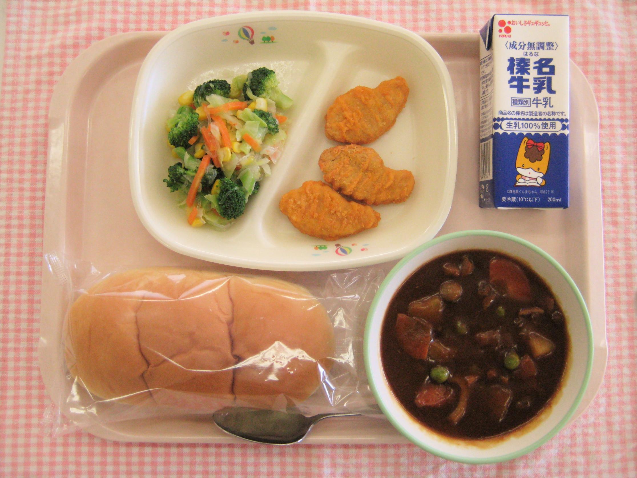 19 ロールパン 牛乳 チキンナゲット きらきらサラダ ブラウンシチュー