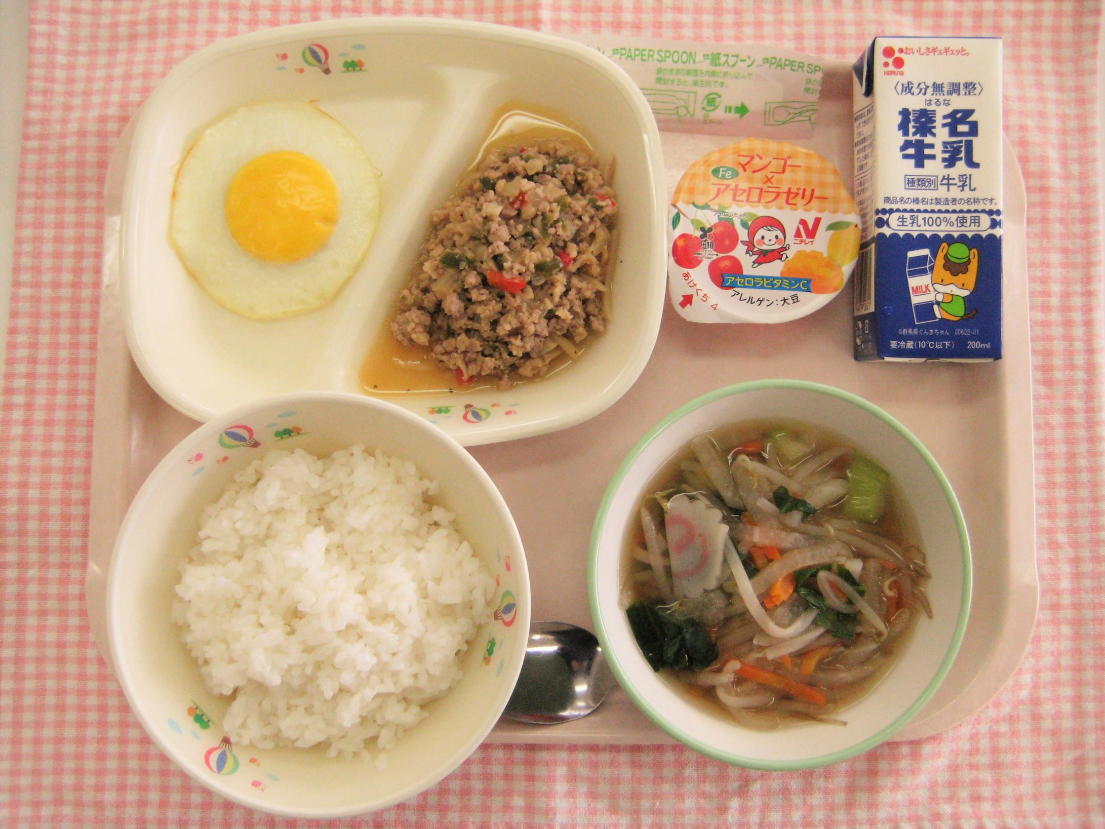 18 【世界の料理:タイ】 ごはん 牛乳 目玉焼き ガパオライスの具 クイッティアオスープ マンゴーアセロラゼリー |