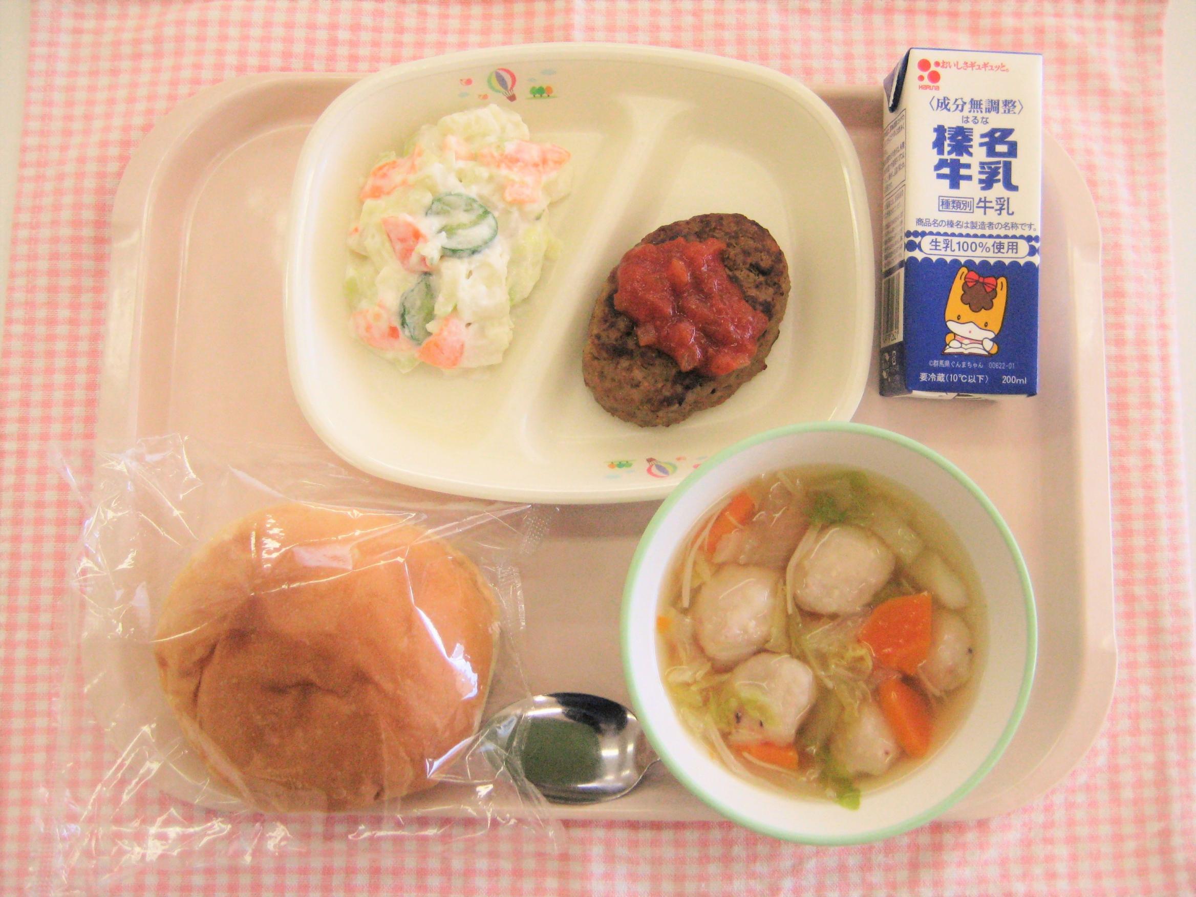 21 丸パン横切り 牛乳 ハンバーグトマトソースかけ ポテトサラダ いかボールスープ