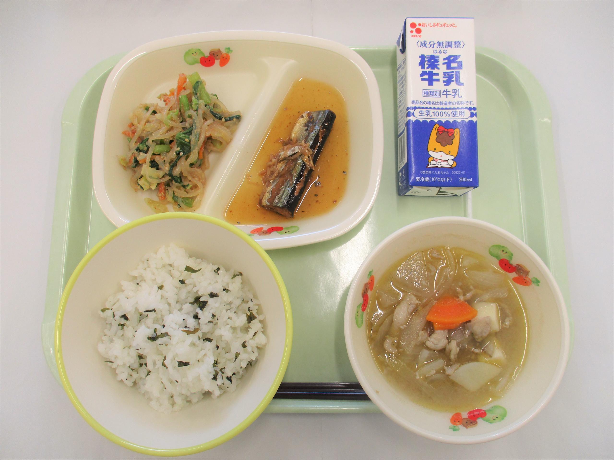 4 わかめごはん 牛乳 サンマの生姜煮 豚汁 |