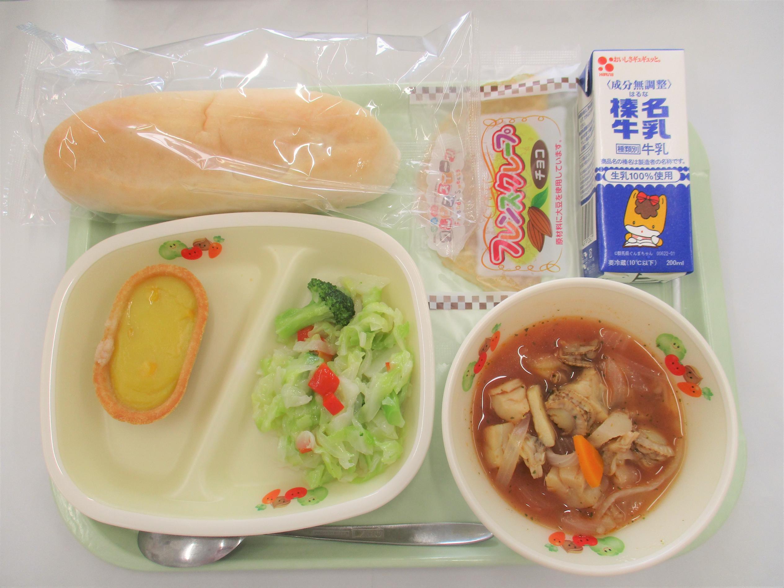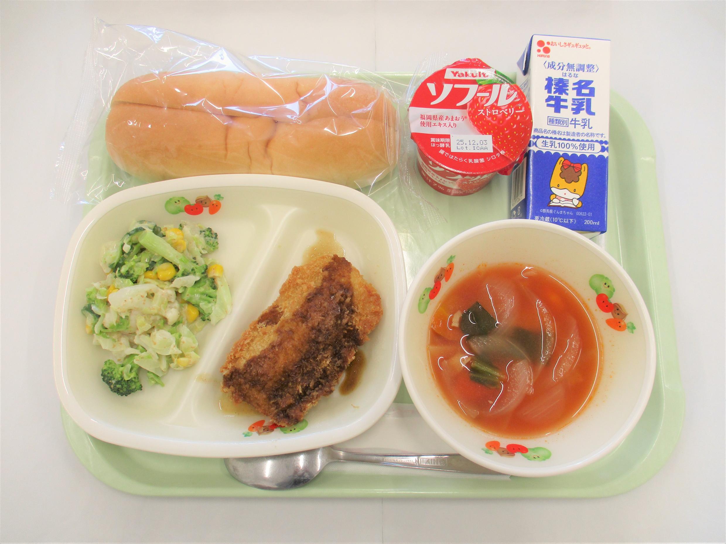 19 背割りこめっこぱん 牛乳 いかフライソースがけ 花野菜サラダ ミネストローネ いちごヨーグルト |