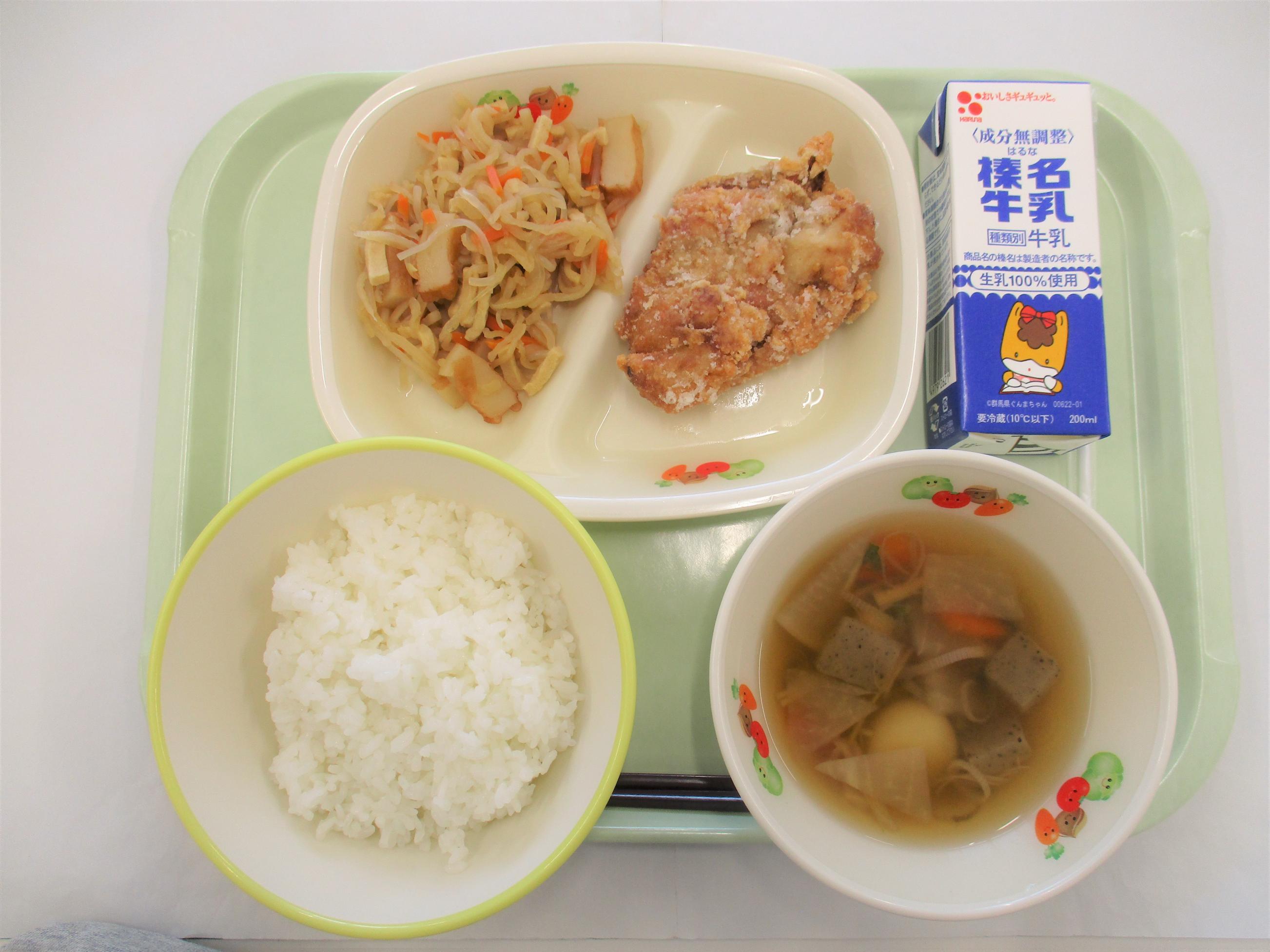 7 [かみかみ献立] ごはん 牛乳 鶏肉のから揚げ 切干大根の炒め煮 かみかみ汁 |