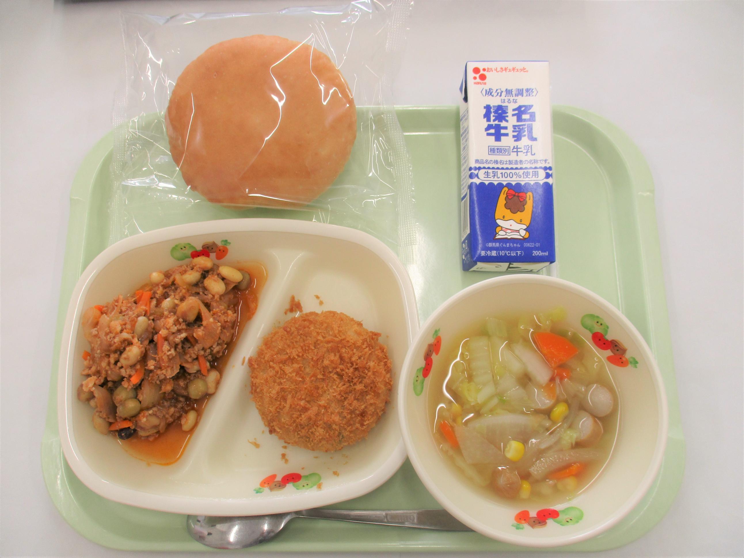 10 丸パン 牛乳 ぐんまのねぎこんコロッケ チリコンカン 野菜スープ |