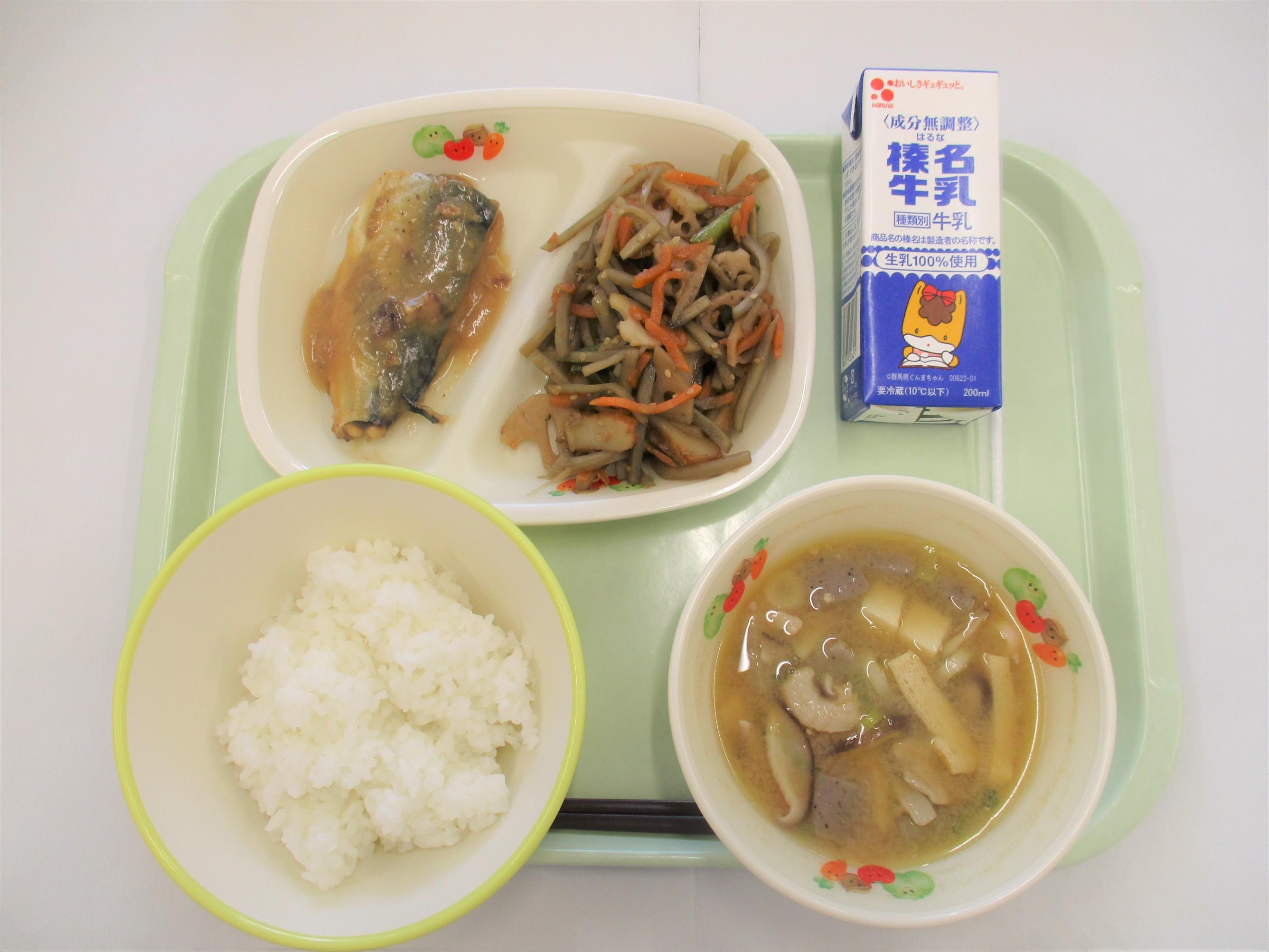 11 ごはん 牛乳 さばのみそ煮 きんぴらごぼう こしね汁 |