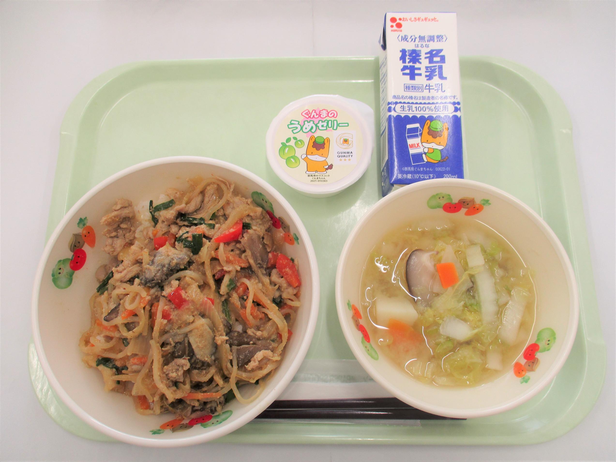 13 ごはん 牛乳 しぶきた丼の具 ふるさと汁 ぐんまの梅ゼリー |