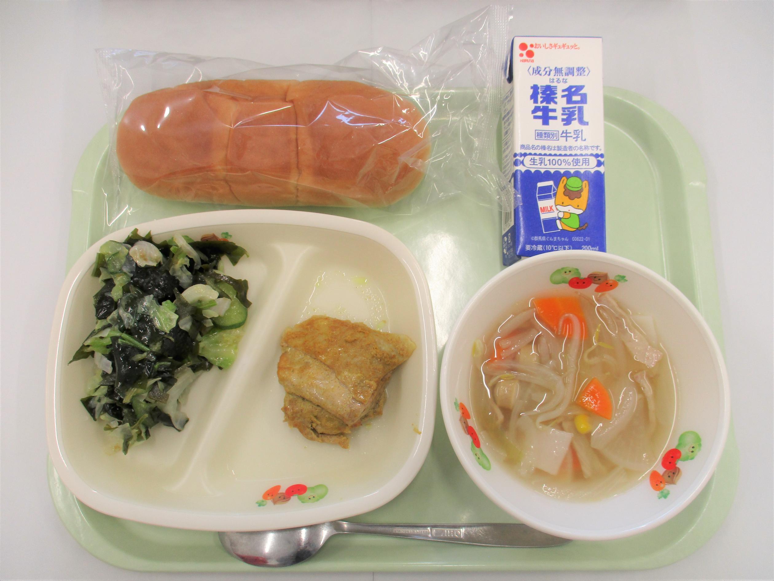 14 ゆめロール 牛乳 タンドリーチキン かむかむ海藻サラダ 米粉のワンタンスープ |