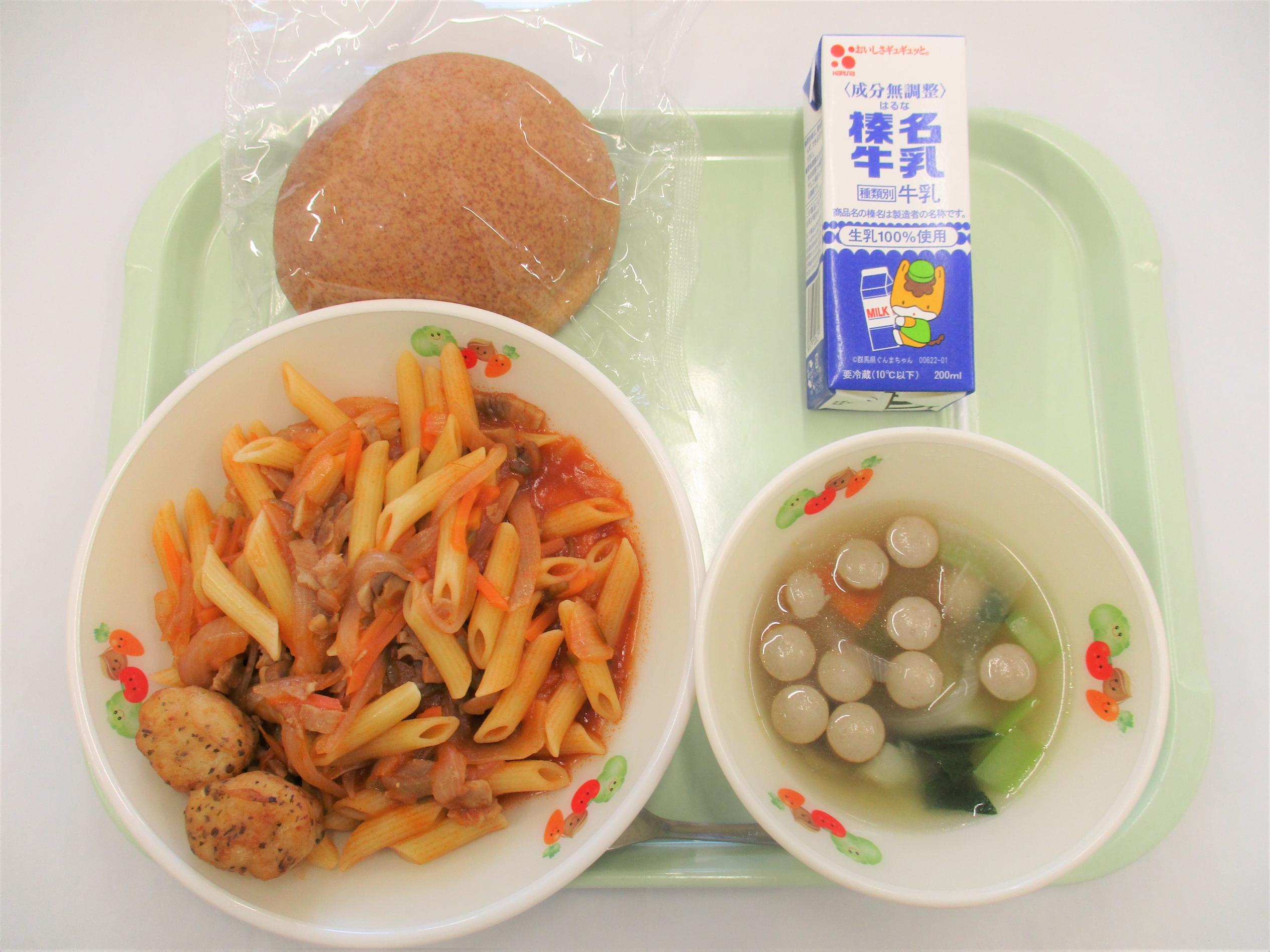 17 バンズパン 牛乳 鶏肉のレモンバジルナゲット ペンネのナポリタン 根菜スープ |