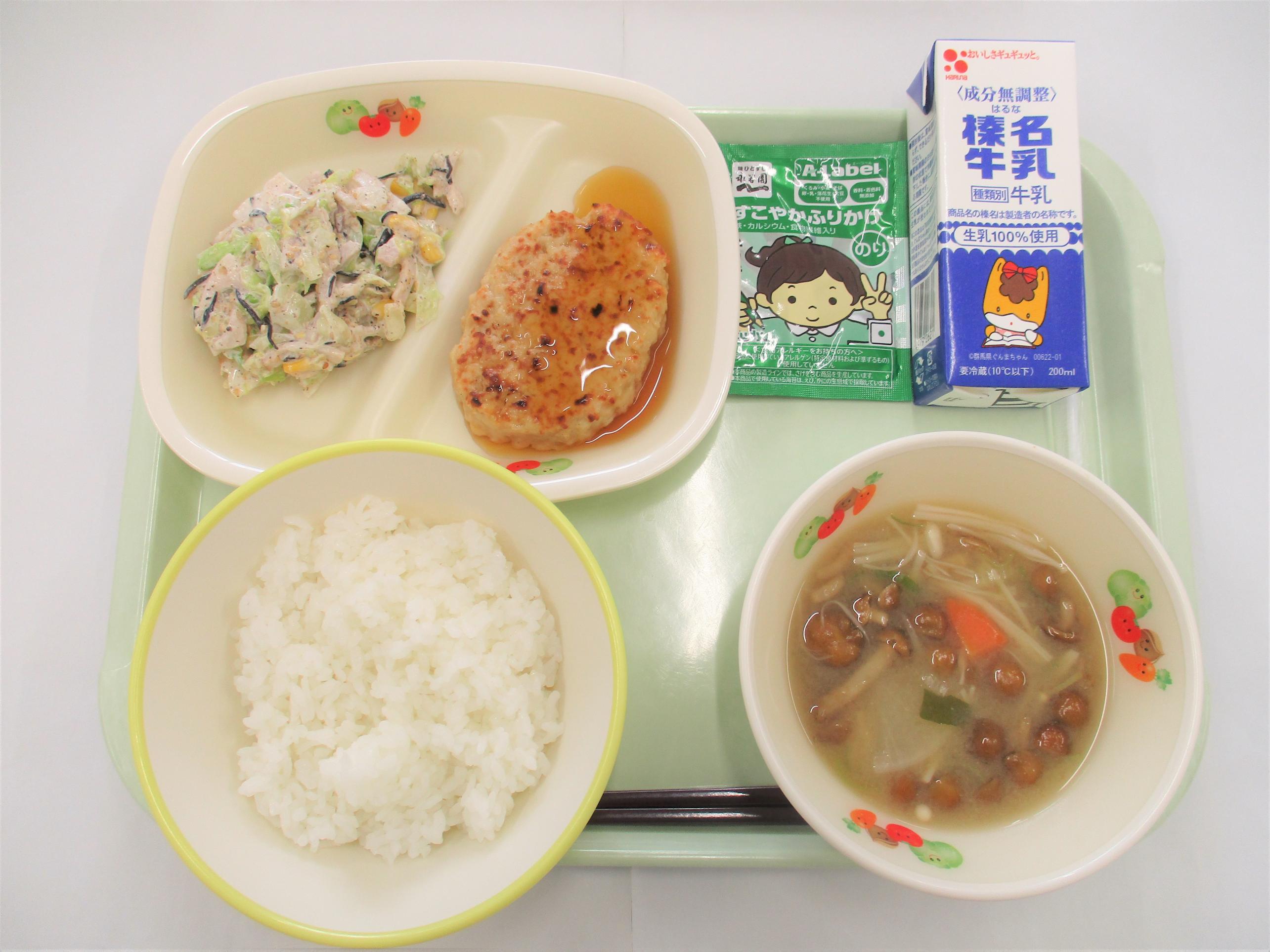 18 ごはん 牛乳 豆腐ハンバーグ和風ソース れんこんとひじきの和え物 なめこのみそ汁 のりふりかけ |