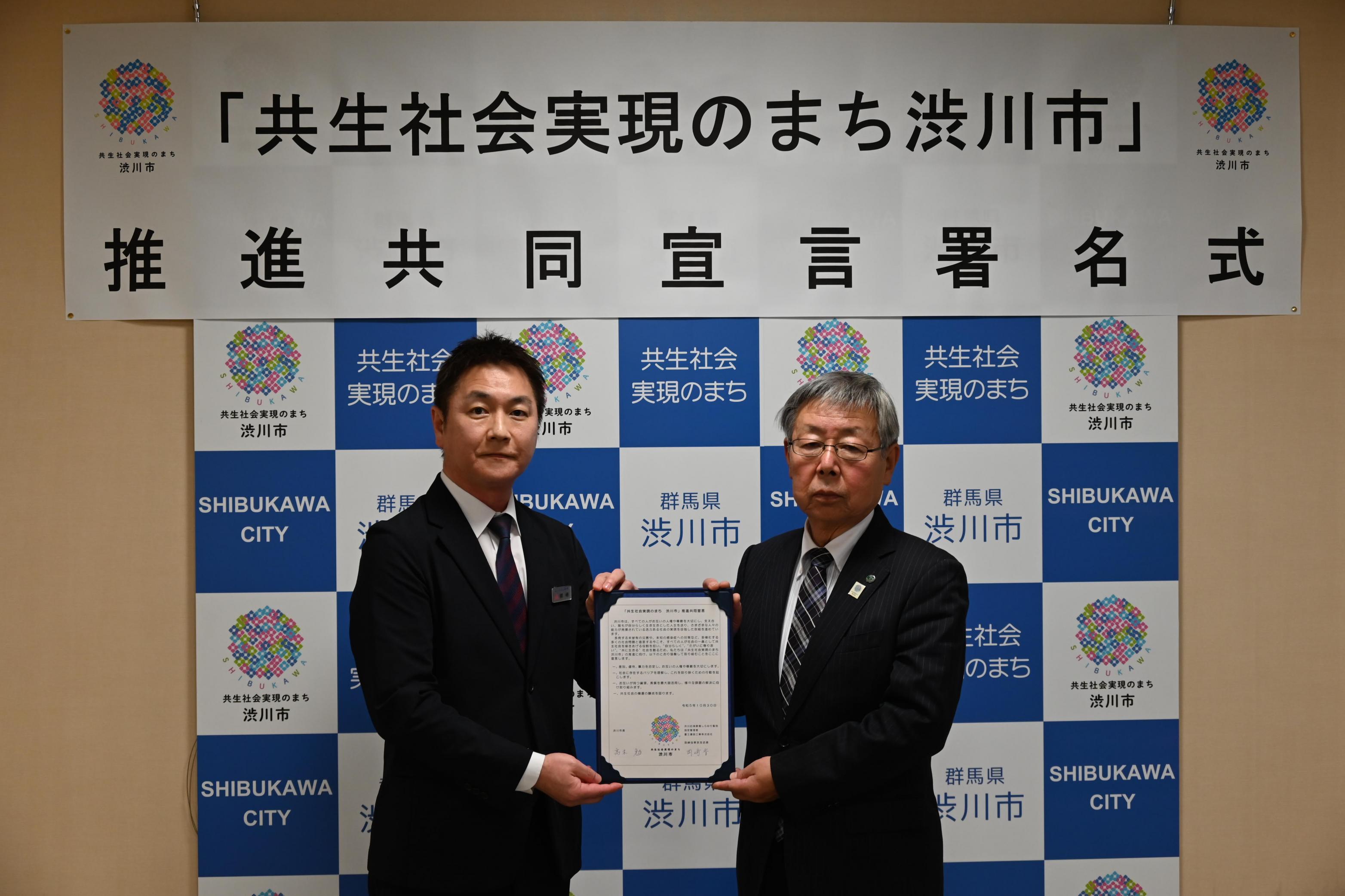共生社会の実現に向けた取り組みの輪を広げ、機運の醸成を図るため、「共生社会実現のまち 渋川市」の推進に向けた取組を、市と共に行う各種団体と共同宣言に署名しています。